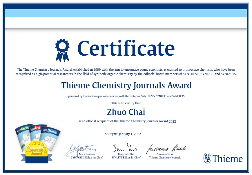 该学术奖设立于1999年,每年颁发一次,面向来自全世界处于独立学术研究生涯早期、崭露头角的科研人员,获奖者由德国学术出版公司Thieme Verlag旗下三个著名有机合成化学期刊SYNTHESIS、SYNLETT和SYNFACTS的编委在全球范围内遴选,授予在化学合成、催化及有机化学相关领域取得出色成果并具有突出发展潜力的青年学者,旨在认可和鼓励年轻一代有机化学家。2022年度,全球范围内共有79人荣获“Thieme Chemistry Journals Award”学术奖。