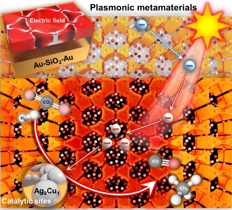 光催化过程主要包括三个关键步骤,分别是光吸收,电荷分离,转移到活性位点激活底物分子。多数光催化剂受限于较窄的光谱吸收范围和较高的电荷重组几率而导致较弱的催化活性,因而开发具有宽太阳光谱吸收和优异的光热转化能力,快速的界面电荷转移,对二氧化碳分子的高活化效率的催化剂是主要的光催化研究方向。等离激元超材料吸收体作为人工设计和制造的微纳结构,具有精密的几何图案以及特定的尺寸大小,通过对结构的合理设计可以实现灵活的光学可调性和多种催化位点的高效集成,是光热催化反应的理想研究模型。