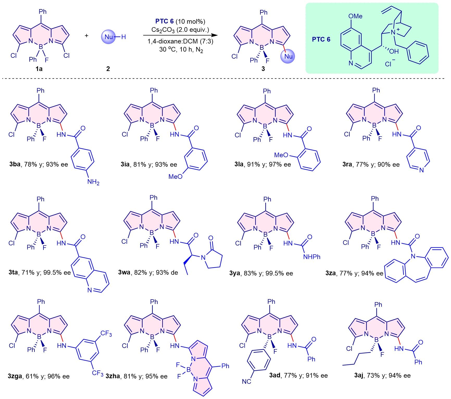 李忠原、郝二红团队在前人的基础上,基于手性相转移催化的不对称芳香亲核取代反应,成功实现了硼手性氟硼二吡咯类化合物的高效合成。