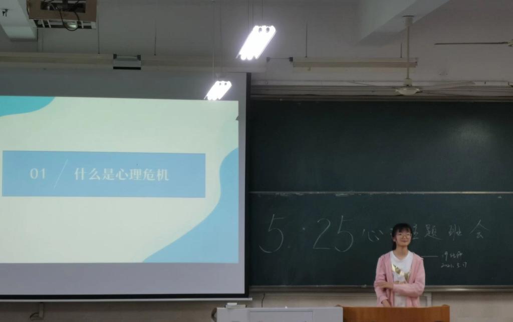 2019级化学2班心理健康委员邵孟玉同学班级同学分享什么是心理危机、大学常见心理危机、理性面对心理危机、合理预防、健康成长等方面的内容,引导同学们正确认识心理危机,让同学们正视心理问题,积极面对,并通过合理饮食、良好的生活规律、积极锻炼等方式放松自己,从而简单预防心理危机。
