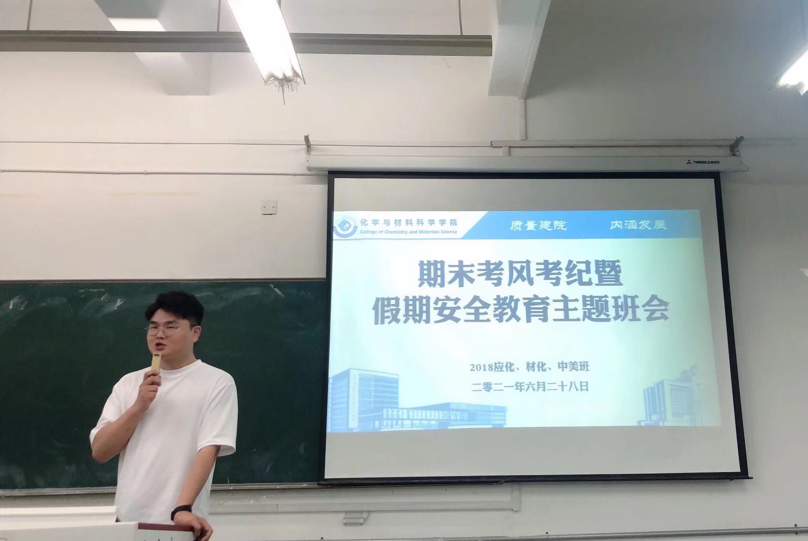 )为端正考风,严肃考纪,进一步增强学生的诚信考试意识,引导学生诚信考试、诚信做人,在期末考试即将到来之际,2018级应用化学、材料化学、化学中外合作专业在辅导员陶勇的主持下于6月28日下午在2070101教室开展了期末诚信考试暨离校安全教育主题班会。
