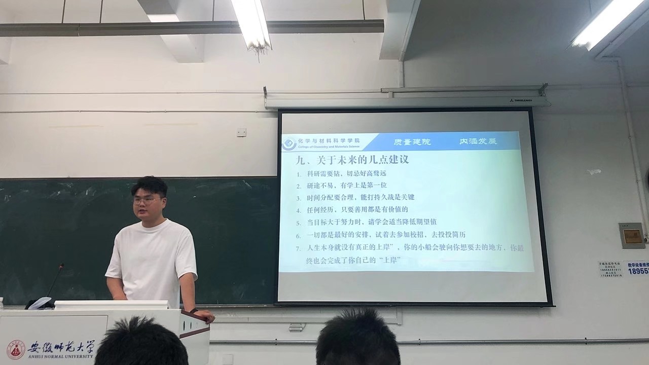 陶勇老师就下学期各项工作安排进行了简要梳理并就未来规划为同学们提供了中肯建议:利用在校时间扎实做好科研训练,科研需要钻,切忌好高骛远,任何经历,只要善用都是有价值的;研途不易,要合理分配个人时间,能打持久战是关键,有学上是第一位;当目标大于努力时,请学会适当降低期望值;要相信一切都是最好的安排;准备就业的同学要积极参加校招,去投投简历。