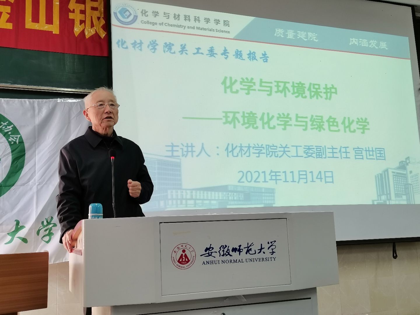 宫世国老师以《化学与环境保护——环境化学与绿色化学》为题向大家开展了专题讲座学习。宫老师在讲座中提出两大问题——化学人如何为生态文明建设做出贡献和化学人如何为环境保护作出贡献。宫老师指出化学污染物占总体的污染物指数比例很高,当今社会我们既要为了美好生活而发展化学工业,也要为了子孙后代而保护环境,依托绿色化学和环境化学而为了我国的环境保护事业作出贡献,实现中华民族的伟大复兴而奉献出我们作为化学人的一份力。在主题讲座的最后,宫老师向同学们提出期望:希望同学们能够在以后的学习生活中提高自身的认识,化学对于人类的贡献的不可磨灭的,希望大家能够认真学习专业知识,为我国的环保事业做出贡献。
