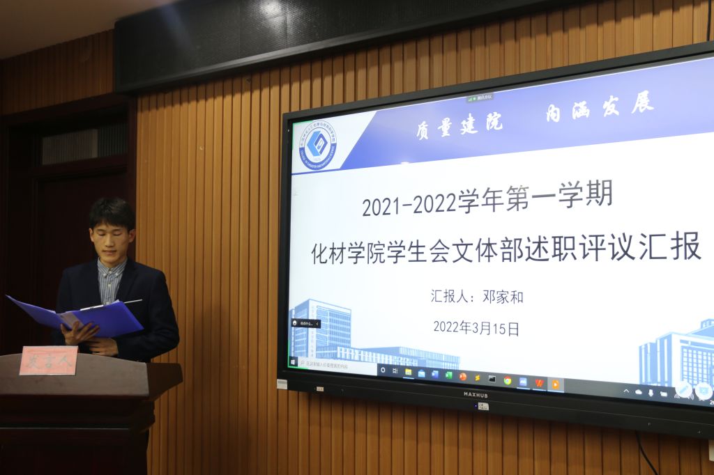 学院学生会主席团成员和各工作部门部长、副部长依次进行述职汇报。9位学生工作人员通过PPT展示和书面述职材料,全面总结了上一学期的工作重点,对个人在学生会组织中的发展情况、政治态度、道德品行、学习情况、工作成效、纪律作风等多方面进行阐述,同时总结学期工作,查找自身不足,提出改进自我的计划与措施。