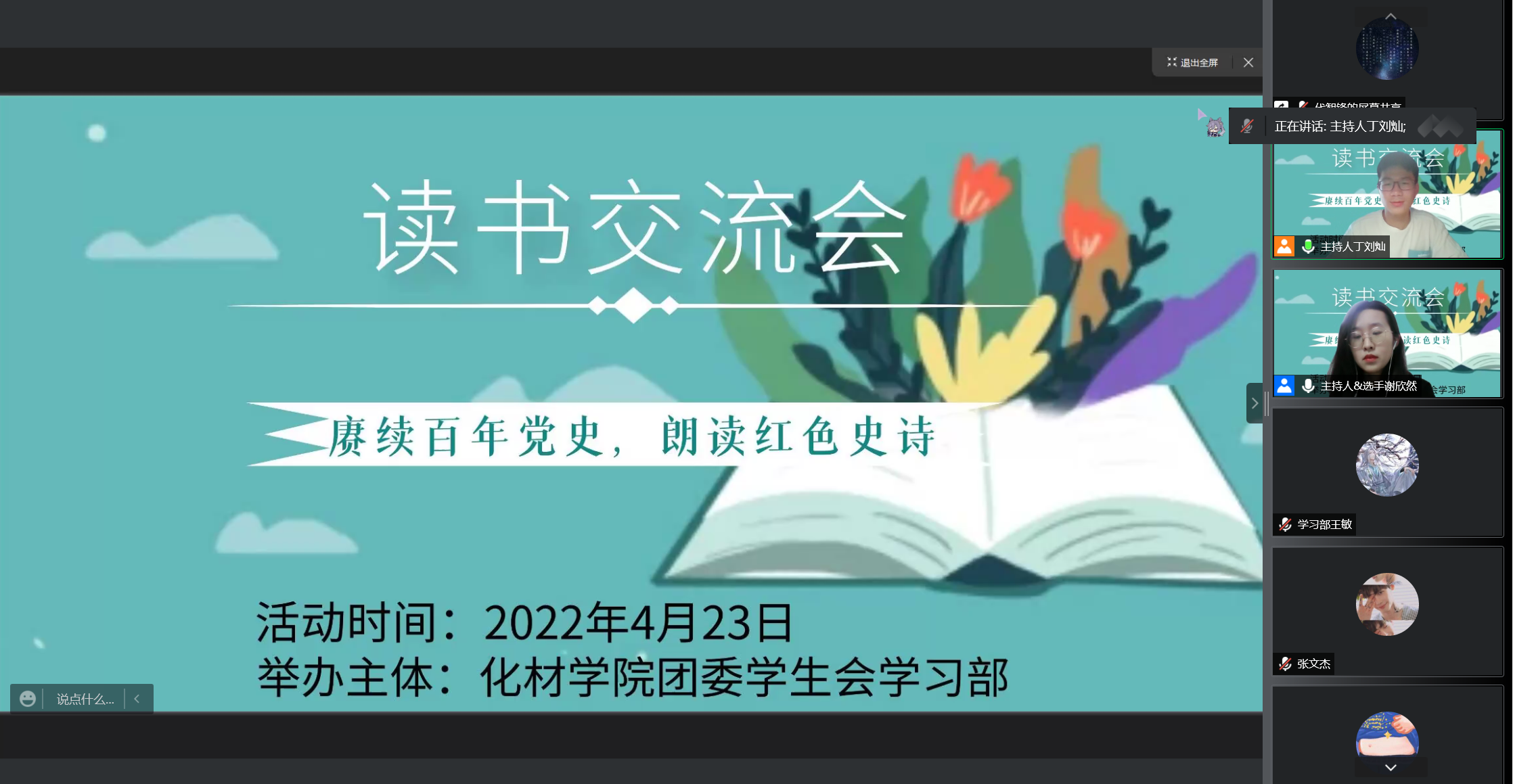 于4月23日下午在线上举行了以“赓续百年党史,朗读红色史诗”为主题的读书交流会活动,本次活动由院学生会学习部举办。2018级本科生辅导员程紫丹出席了本次读书交流会,院学生会主席团成员参加会议。