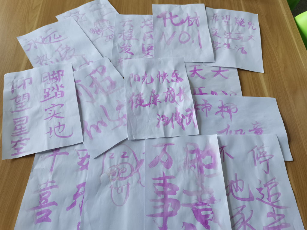 此外,活动现场还提供了无色的氢氧化钠溶液和酚酞试剂,参与的同学通过蘸取氢氧化钠溶液写一份给予大家的心灵寄语,并通过喷洒酚酞溶液使其发生化学反应而显现颜色,活动作品将在现场展览或寄出,该项“妙笔生花”活动结合了化学知识,也突出了卡通色情