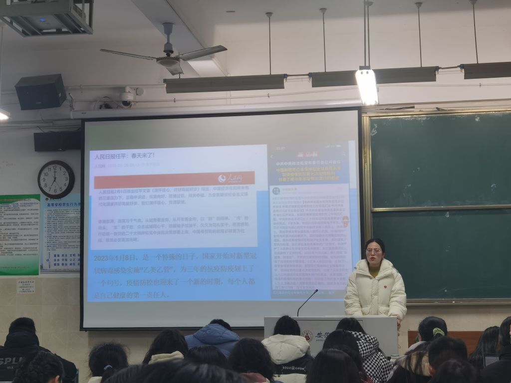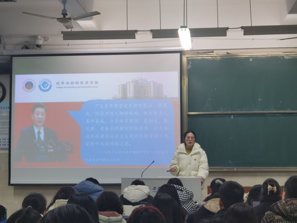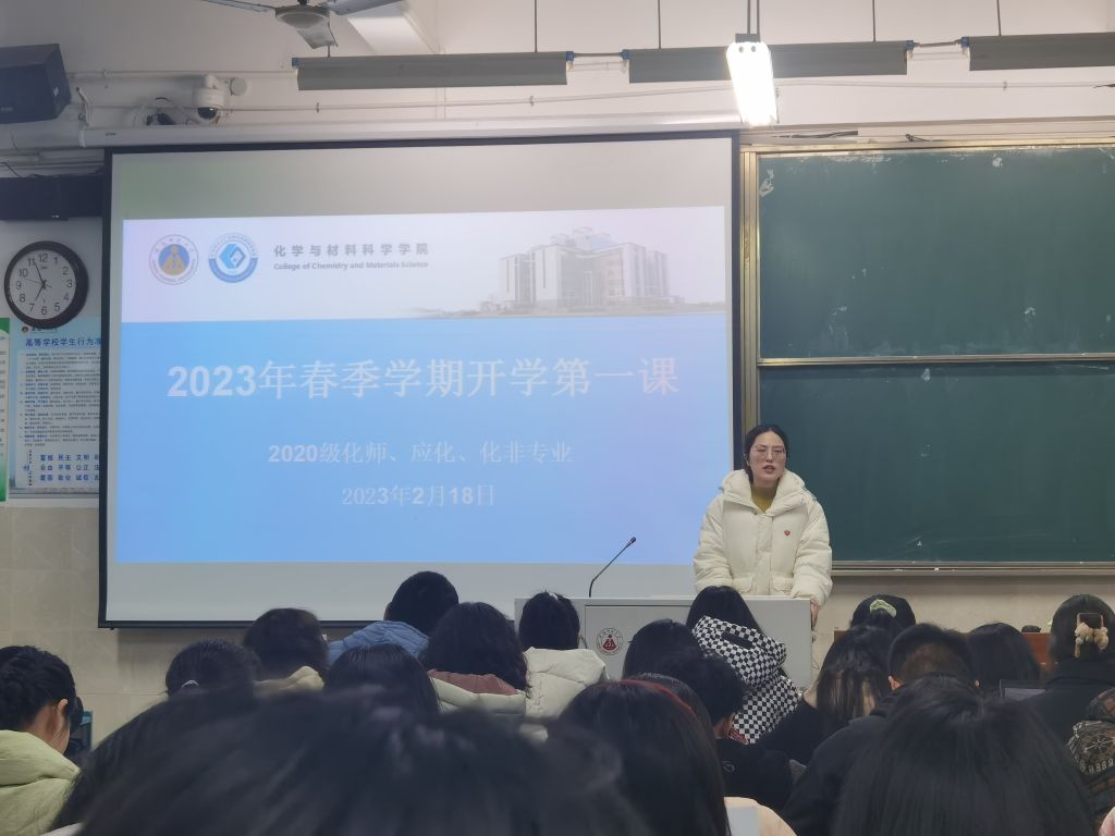 陶佳佳、王芳)春潮澎湃,激荡万千气象,新学期也是新起点,从起势看走势,从开年观全年。为了深入贯彻党的二十大精神,引导学生调整状态,用积极昂扬的心态迎接新学期的挑战,20化师、化非、应化专业于2023年2月18日晚在2010201教室召开了“春季开学第一课”主题班会,本次班会由辅导员王芳老师主持,全体学生到场。本次班会以“青春践行二十大”为主题,围绕着学习贯彻党的二十大精神、战“疫”后教育、诚信考试、安全教育等展开。