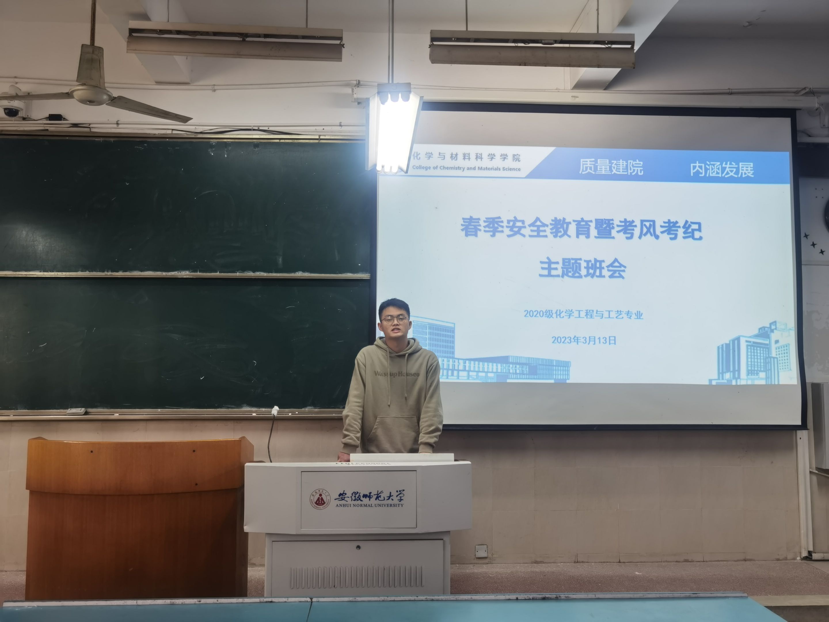 汪芙琳)为扎实推进春季学生安全教育,加强班级学风和考风建设,3月13日,辅导员于洪翔在行知楼2030102教室为2020级化学工程与工艺专业全体同学召开春季学生安全教育暨考风考纪主题班会。