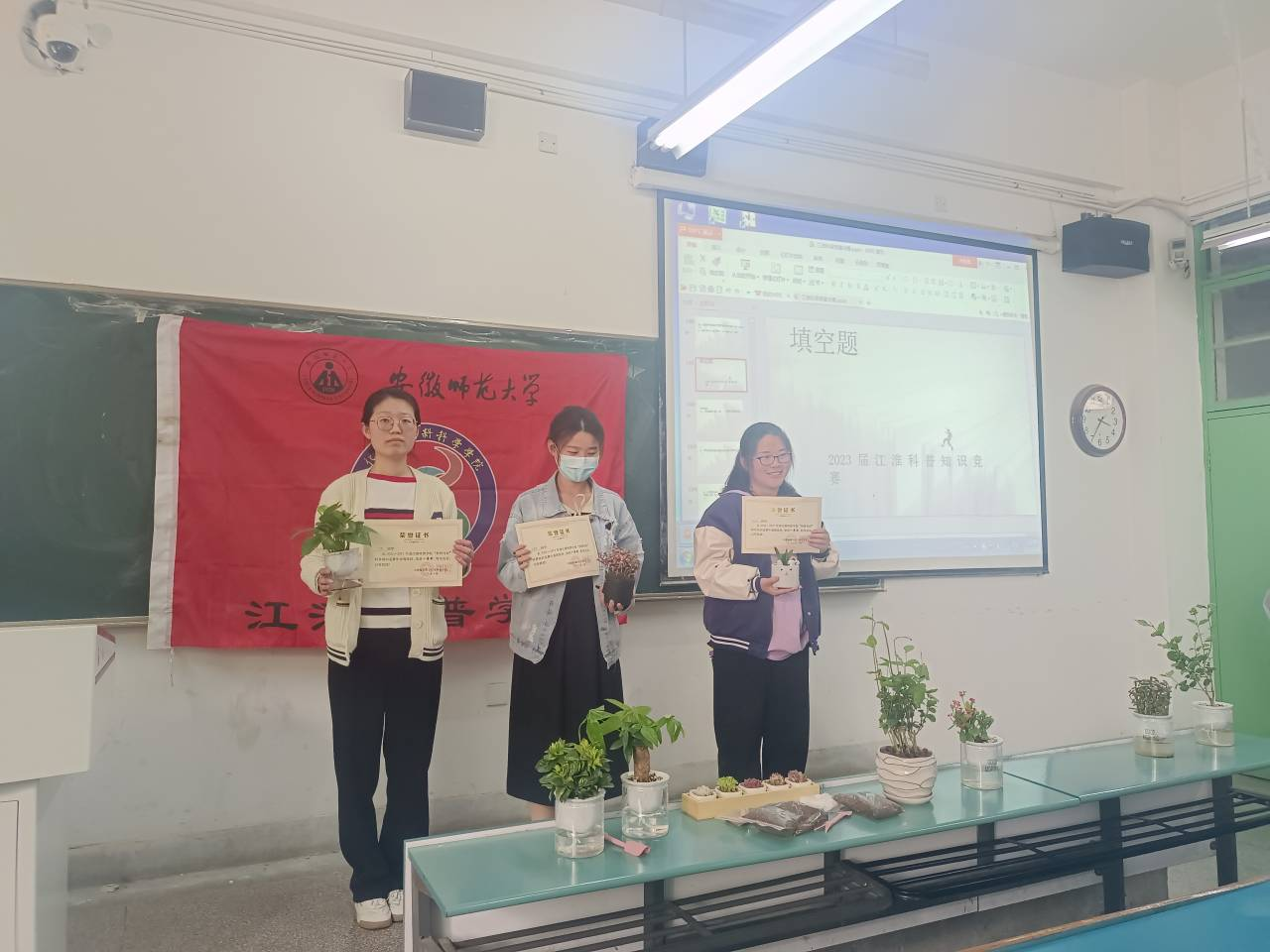 王斯雯、王芳)为普及科学知识,弘扬科学精神,传播科学思想,深入学习贯彻党的二十大精神,江淮科普学校于2023年4月9日下午2点在7号楼102教室开展“科普化材”科普知识竞赛决赛,江淮科普学校副校长汪烨以及各部门部长、部员参加竞赛。