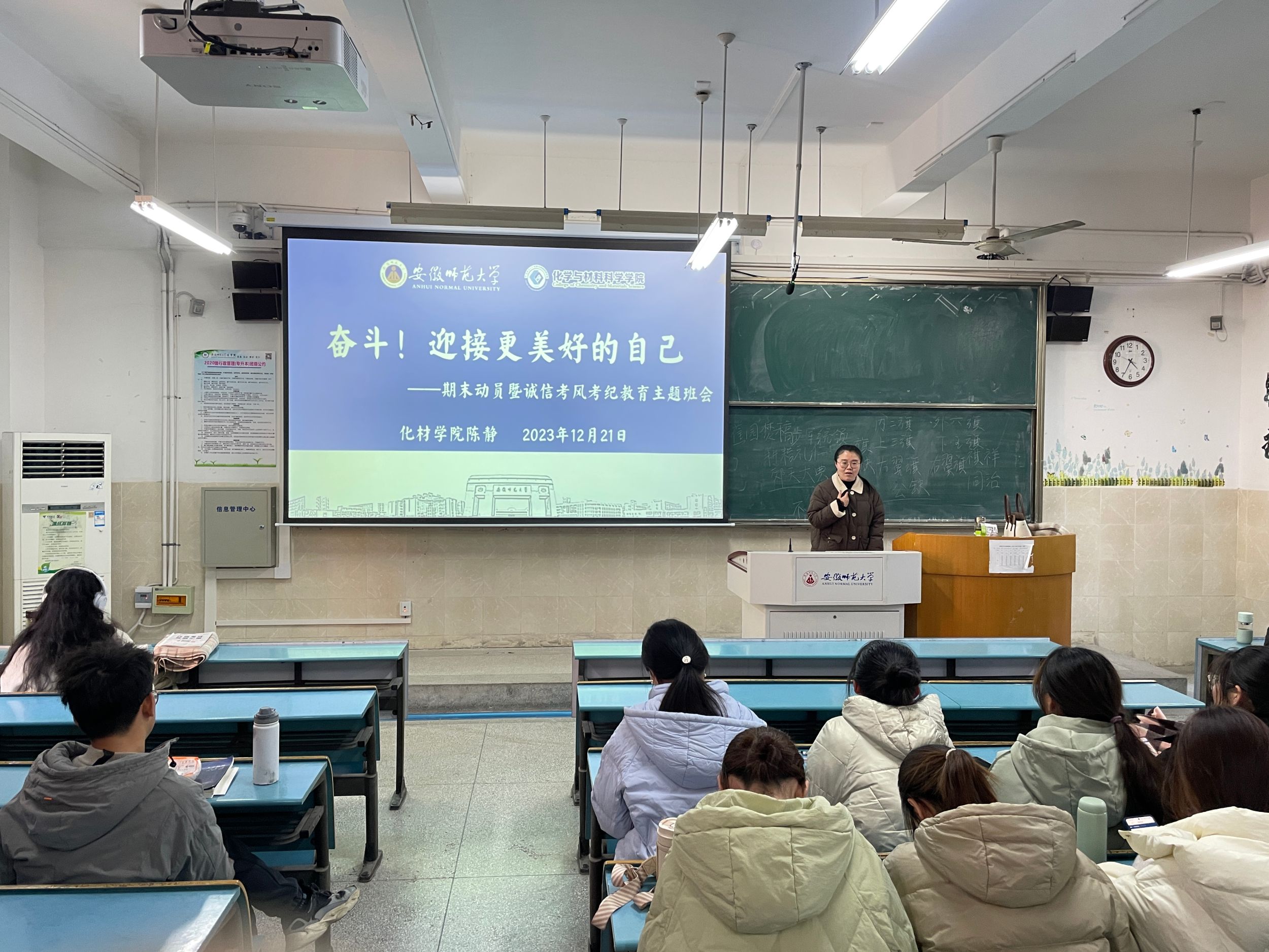 陈静)为及时督促学生期末复习,做好期末工作提醒,调动学生积极性并加强诚信考风考纪教育,确保考试的公平公正性,同时为寒假离校工作做好准备,12月21日-22日,辅导员陈静分别为22化非、化师专业召开期末动员暨诚信考风考纪教育主题班会。