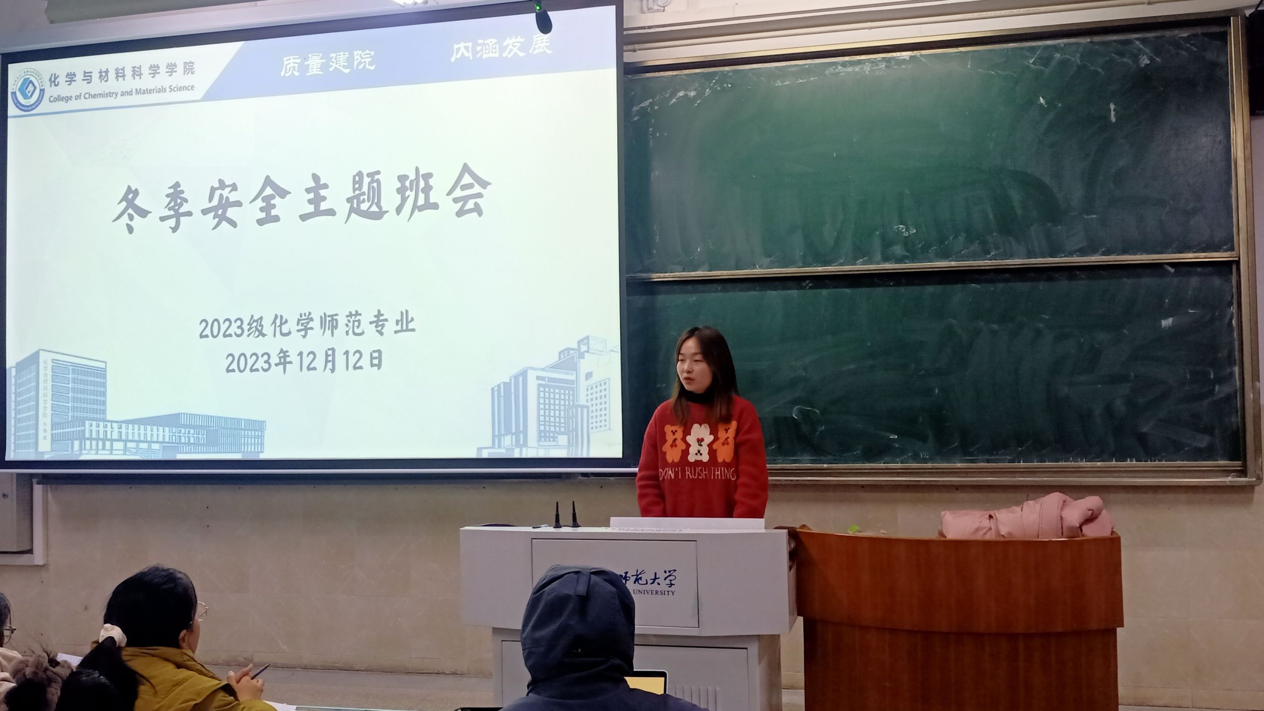 段雨含)为加强学生的安全知识,增强安全意识,提高避险能力,23级化师辅导员王霞于12月12日晚,在行知楼一号楼504教室,开展了冬季安全主题会议,此会议23级化师全体师生参加。