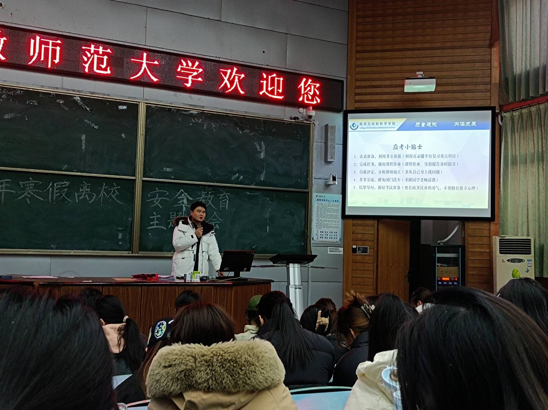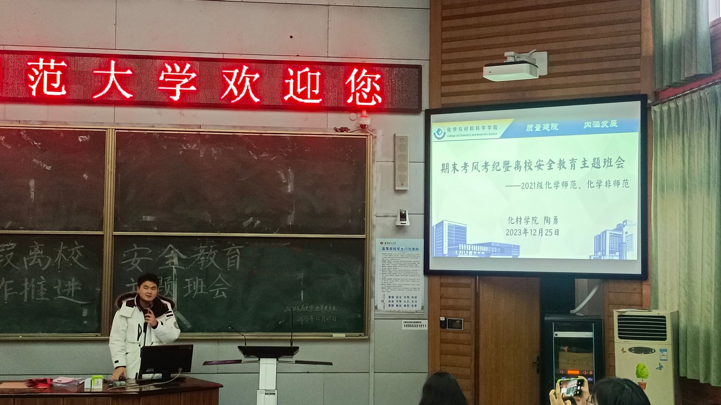 乐效靖、陶勇)为进一步加强学院考风建设,增强学生考风考纪意识,并做好寒假离校安全稳定工作,辅导员陶勇老师于2023年12月25日下午在行知楼2010105教室为2021级化学师范、化学非师范专业全体同学召开期末考风考纪暨离校安全教育主题班会。