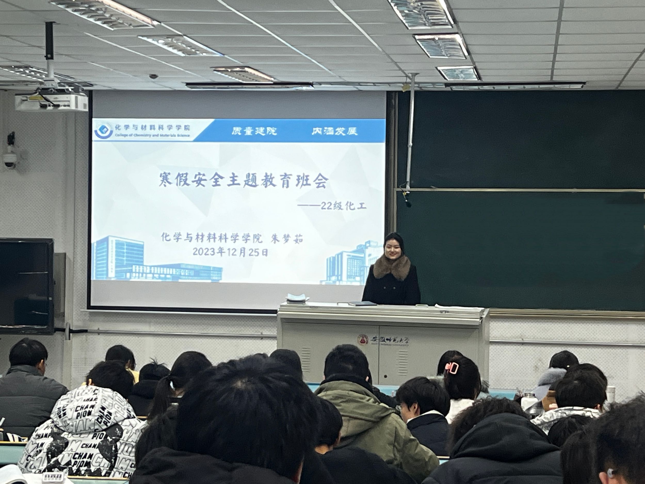 朱梦茹 郁妍)为了加强大学生寒假期间的安全教育,提高学生的自我保护意识和能力,2023年12月26日晚上,化学工程与工艺专业在7号楼401开展了安全教育主题班会,本次班会主持人为辅导员朱梦茹老师。