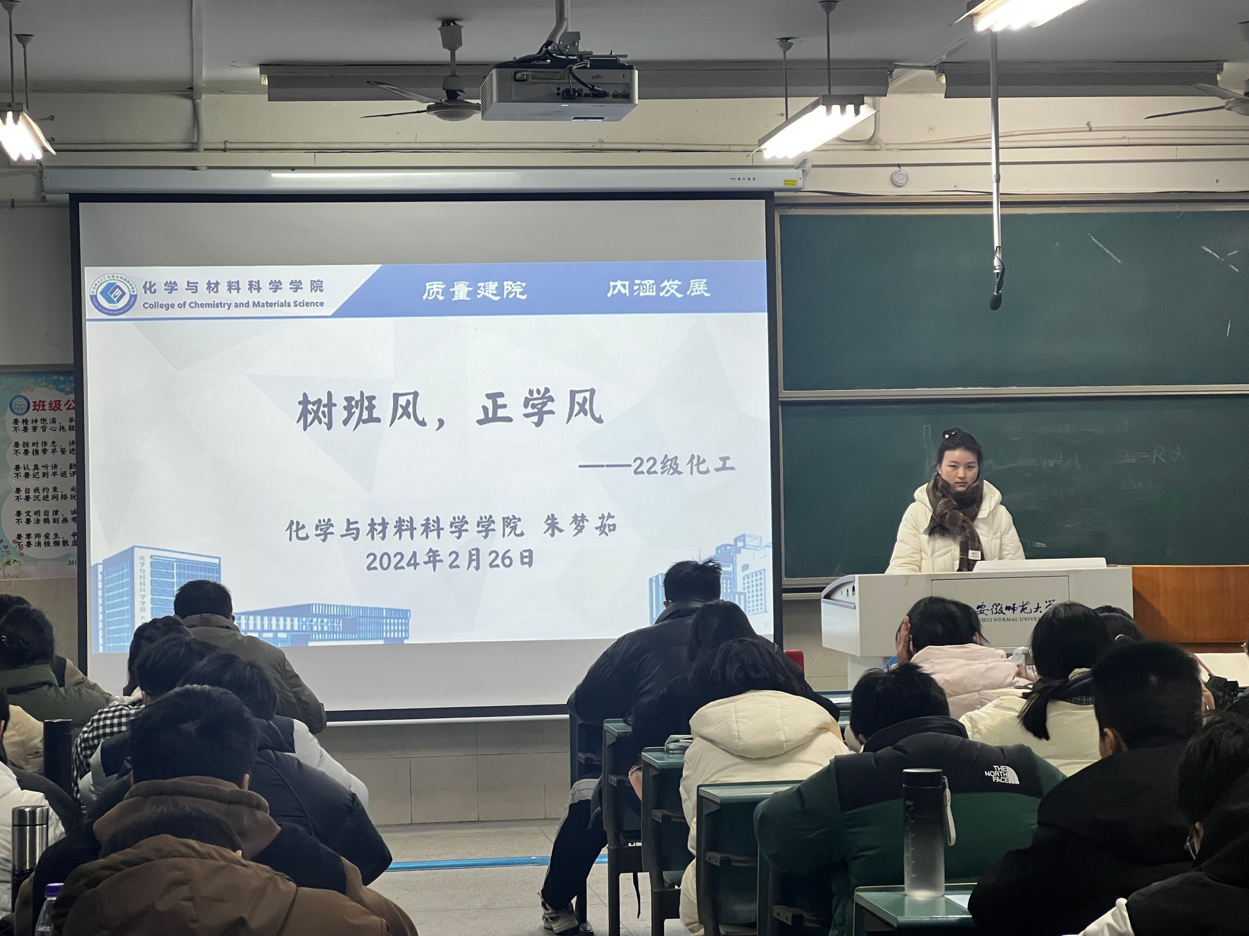 郁妍 朱梦茹)为了迎接新学期的到来,2024年2月26日晚上,化学工程与工艺专业在2010606开展了开学第一次班会,本次班会由辅导员朱梦茹主持。朱老师首先对同学们的到来表示了热烈的欢迎,并祝大家在新的学期里取得更好的成绩和进步。随后,向同学们传达了学校的一些重要通知和要求。