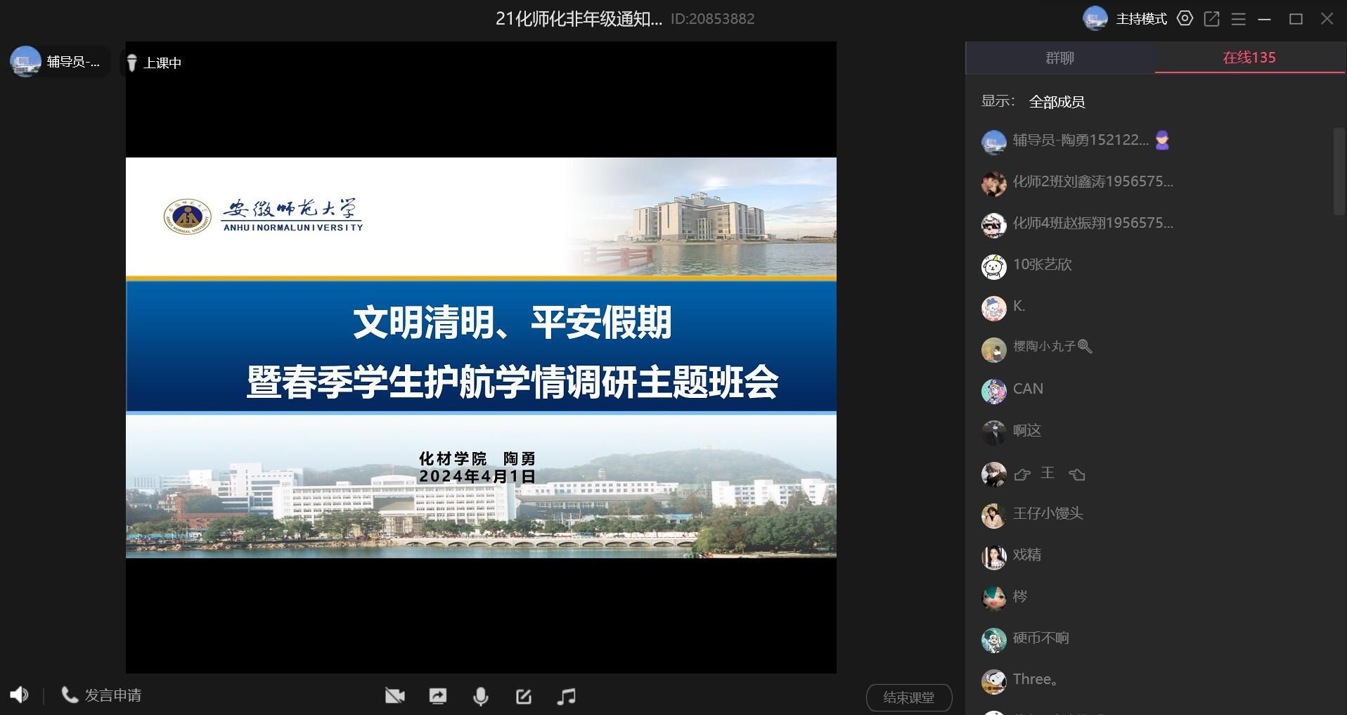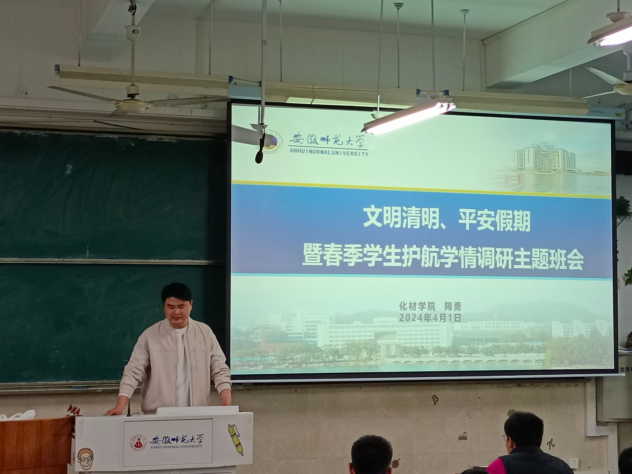 盛莹)清明假期即将到来,为布置假期安排,保障同学们度过一个健康、平安、祥和的假期,以及做好春季学生护航工作。4月1日,辅导员陶勇分别在线上和线下为21化师、化非专业全体同学召开了“文明清明,平安假期”暨春季学生护航学情调研主题班会。