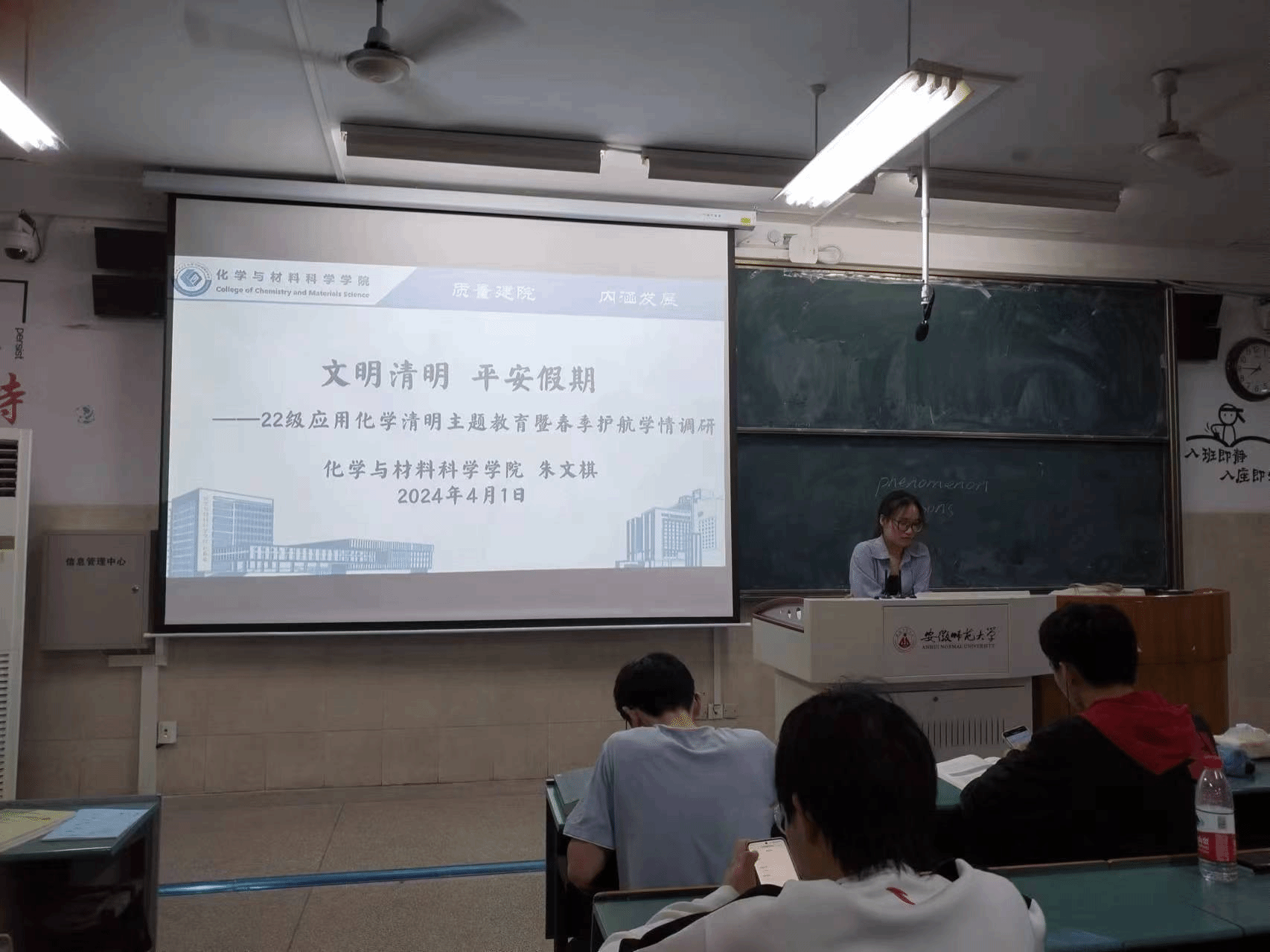 朱文棋 许静媛)清明假期即将到来,为了保障同学们能够健康、平安的度过假期,4月1日晚上在2010602教室朱文棋老师为应用化学专业的同学开了一次清明安全主题教育暨春季学生护航学情调研主题班会。