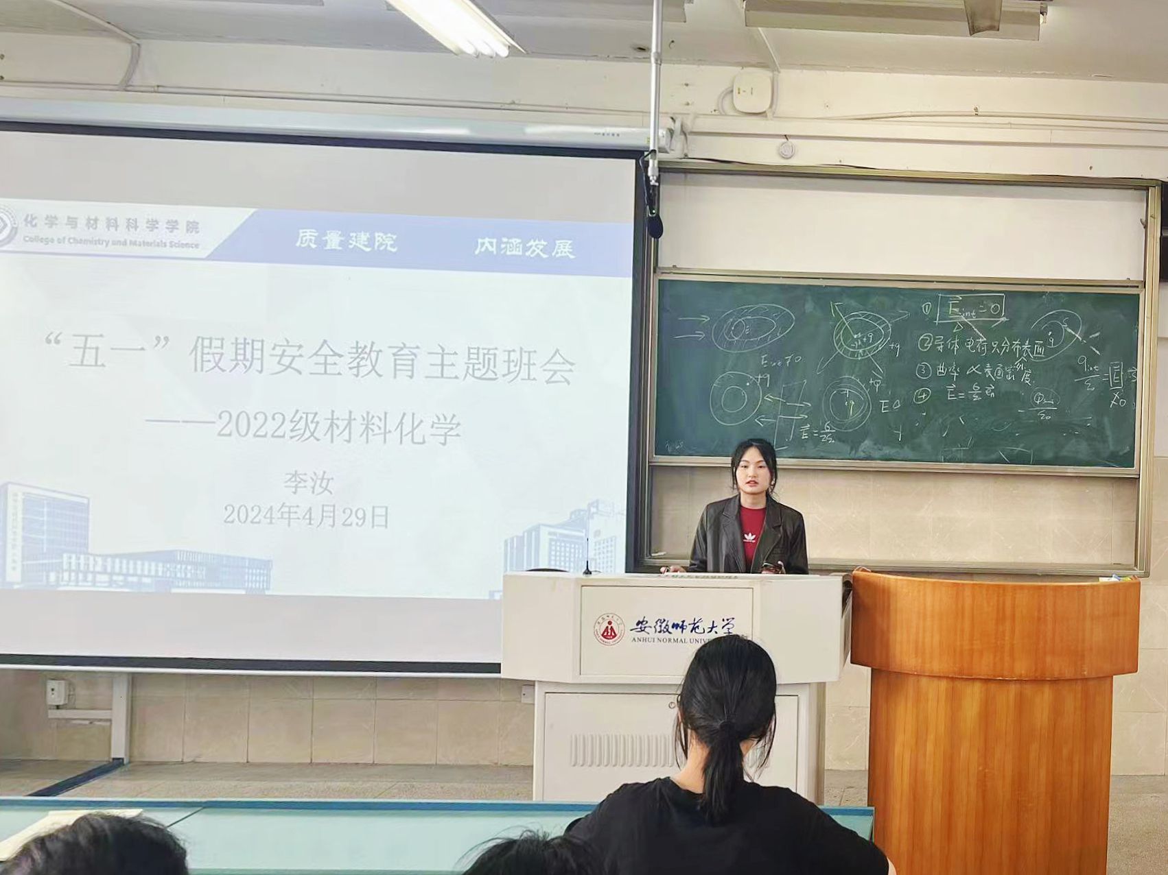 李汝)为做好“五一”劳动节放假期间本科生的安全教育管理工作,2024年4月29日11时2020606教室,22材料化学专业辅导员李汝为该专业全体同学召开了“五一”假期安全教育主题班会。