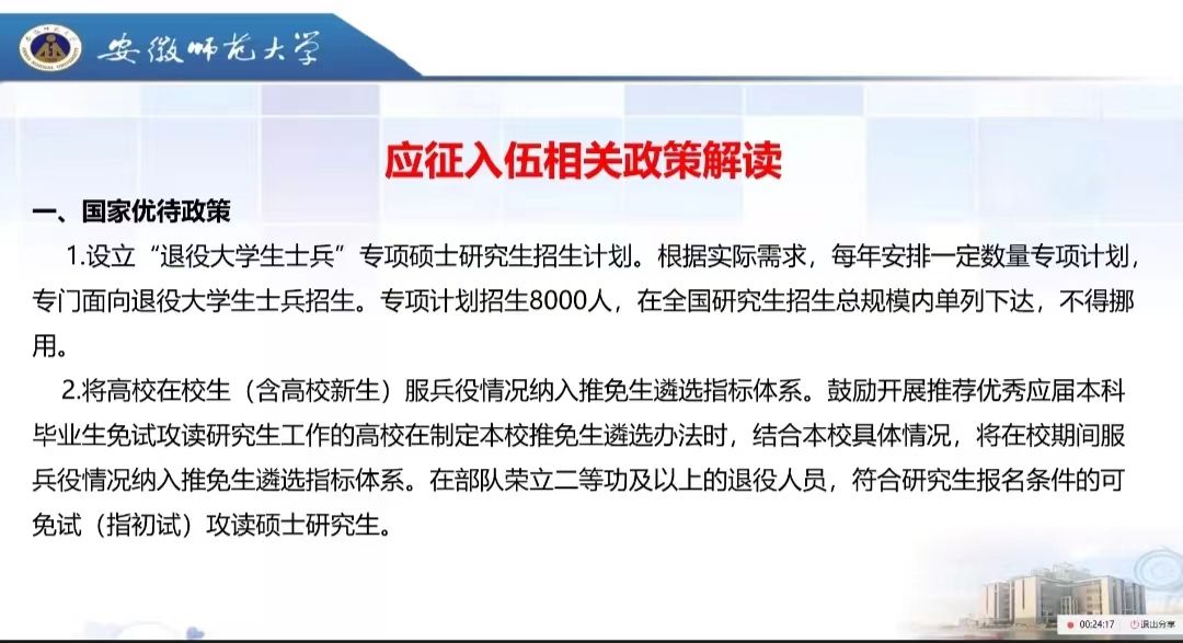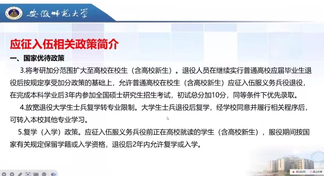 随后,为进一步推进我校2024年秋季应征入伍工作,提升广大青年学生的国防意识,陶勇从国家优待政策、芜湖市优待政策、学校优待政策 、入伍后在部队发展途径、退役后发展途径等方面详细解读了征兵政策,引导同学们把参军入伍当做锻炼磨砺自己的大舞台,在主动承担重任、积极投身国防的同时实现个人能力素质的全面提升。