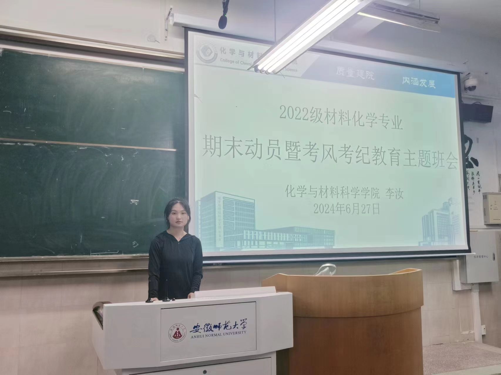 李汝)6月27日晚,2022级材料化学专业于2020101开展期末动员暨考风考纪教育主题班会,会议由辅导员李汝主持,全体同学参加。