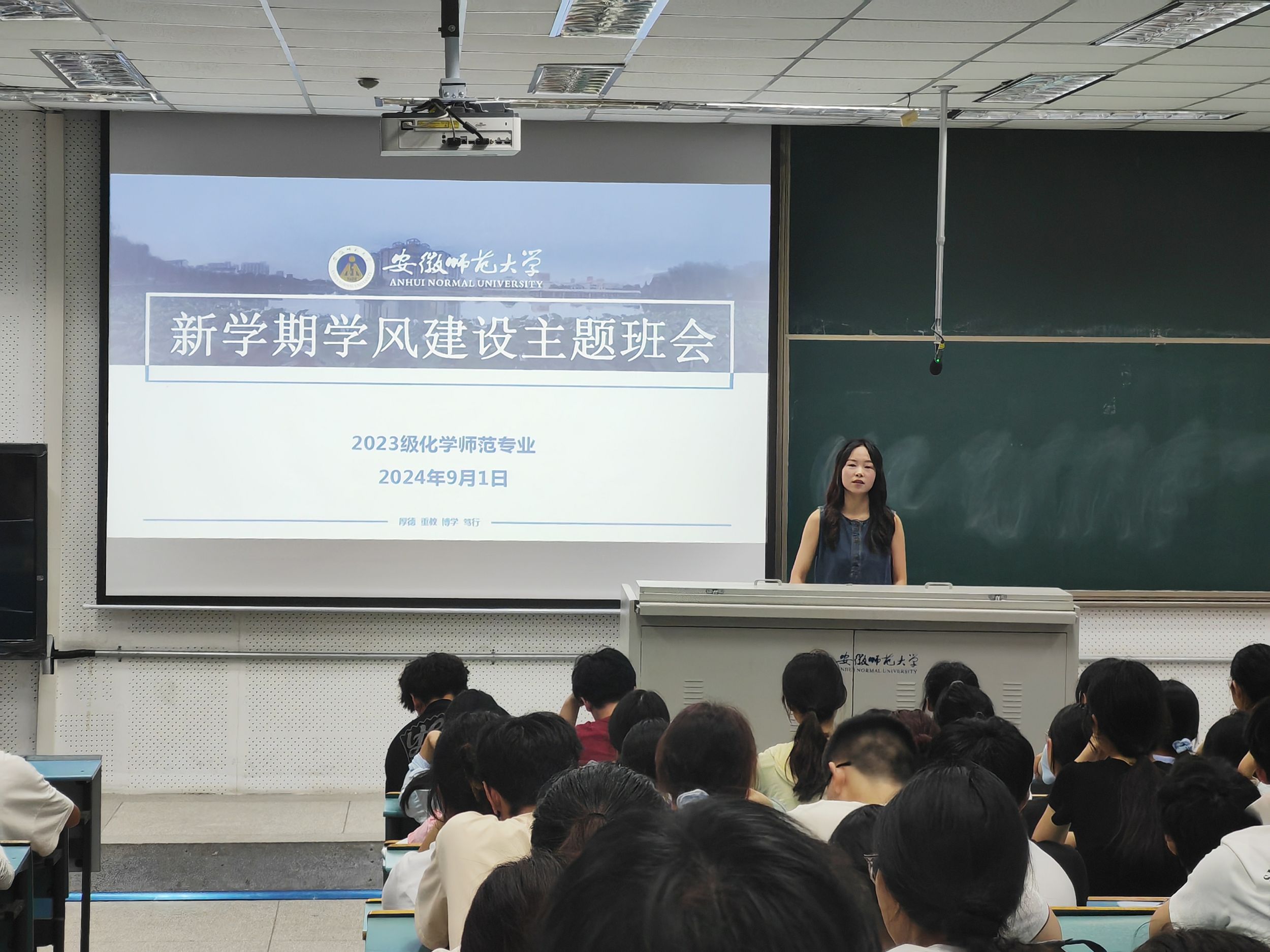 段雨含)为提高学生学术水平,培养学生的道德品质、思想素养,引导学生树立正确的学习态度、价值观念,辅导员王霞于9月1日下午,在行知楼各教室分班级开展了学风建设主题班会,全体学生参加。