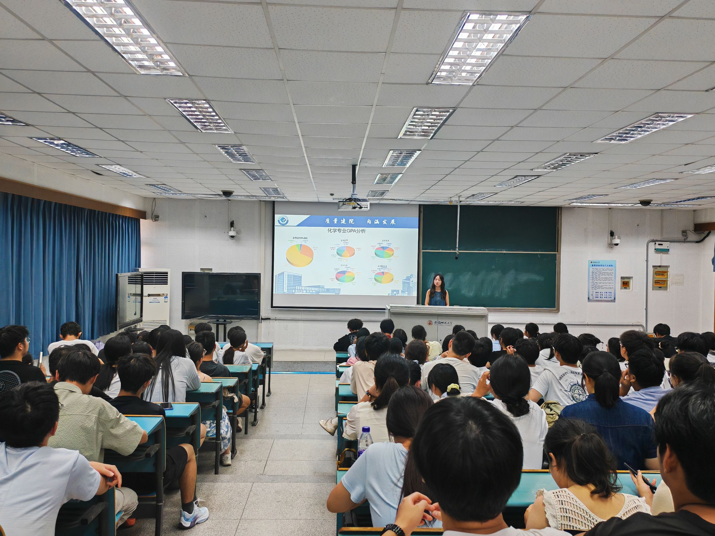 会议伊始,辅导员王霞强调了学风建设的重要性,学风是学校体现治学之风、教学之风以及学习之风的总和,它是校园的办学质量以及治学理念的外在表现,是学校优良校园传统文化的基本体现。随后,辅导员王霞对上学期各班级学生的成绩情况进行了详细的分析,主要从挂科情况、专业绩点分析、英语四六级通过情况等方面讲解整体情况,并提出上学期学生们在学习中出现的问题。同时辅导员也强调了学生们在努力学习的过程中,也要注重培养自身的综合素质。积极参与各种社团活动和志愿者服务,提升自己的团队合作能力和社会责任感。这些活动不仅能丰富学生的课余生活,也能为学生们提供实践和锻炼的机会。另外,辅导员也提醒了补考的同学,一定要诚信考试,严肃考风考纪。