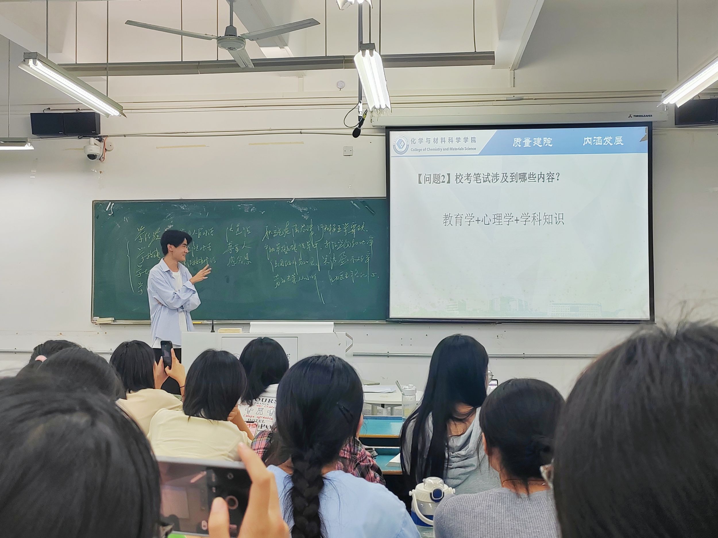 本次会议邀请了学校首届金牌师范生代表、第九届"田家炳杯"全国师范院校师范生教学技能竞赛一等奖获得者2021级化学师范专业万文均同学详细地就教师资格证校考备考注意事项和师范生如何提升技能两个方面进行介绍,并为同学们答疑解惑。