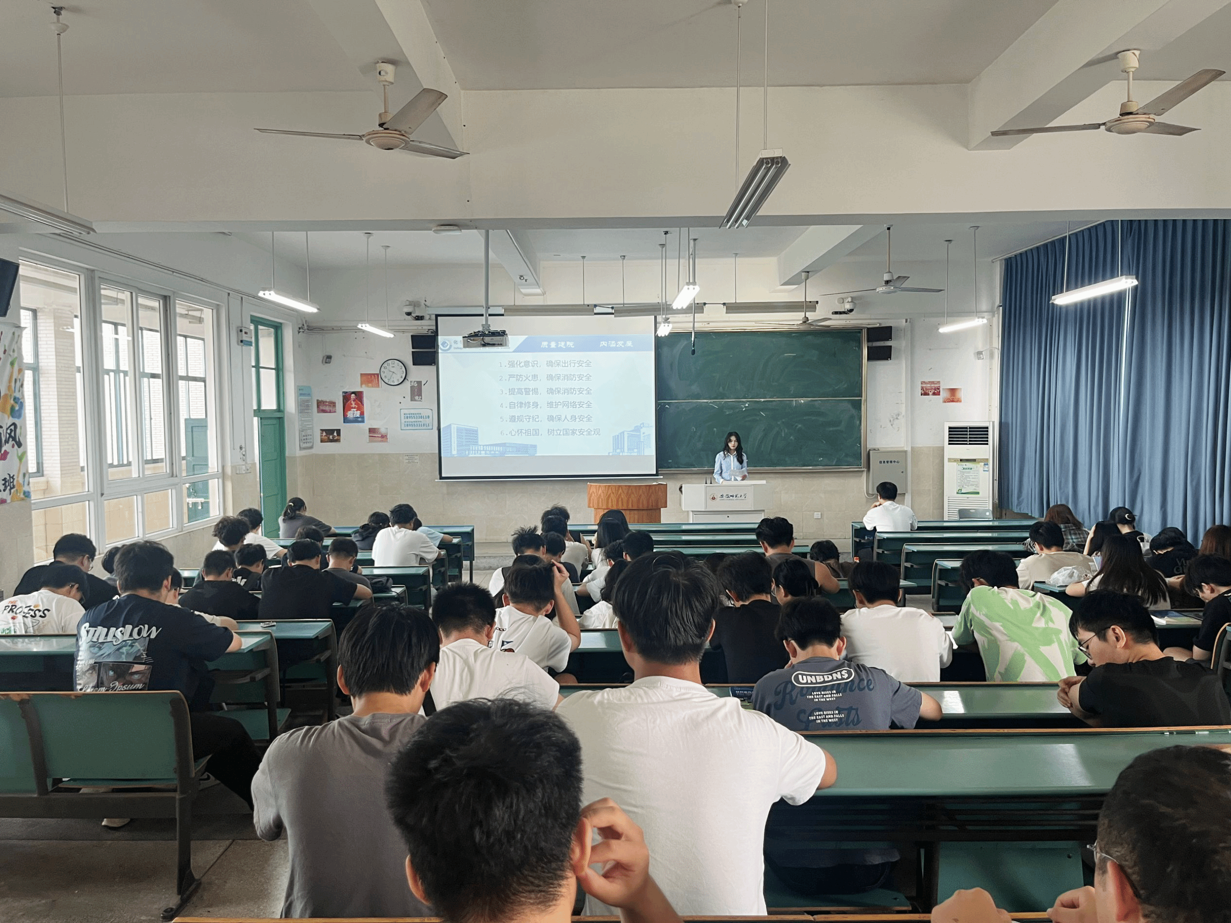 李汝老师围绕六方面内容讲述国庆假期的安全问题。第一,强化意识,确保出行安全。在交通安全方面,提醒同学们从正规渠道购买出行、返校车票,遵守交通安全法规并严防自然灾害。第二,严防火患,确保消防安全。李老师提醒大家要遵守公寓管理规定,严禁在宿舍内存放和使用违禁电器,不私拉乱接电线等,此外,叮嘱同学们要遵守实验室安全管理规定。第三,提高警惕,确保财产安全。李老师指出,要谨防电信网络诈骗,避免陷入不良网贷,提升识骗和防骗能力。第四,自律修身,维护网络安全。要坚守网络道德与秩序,遵守网络管理法律法规,自觉营造清朗健康的网络环境。第五,遵规守纪,确保人身安全。李老师告诫学生要防范溺水事故,做到“六不一会”,遵守离返校登记与线上线下晚点名制度,并养成良好的生活习惯和健康的生活方式,以良好的精神状态投入节后正常的学习生活。第六,心怀祖国,树立国家安全观。辅导员还就国家安全观进行了详细的讲解。讲述个人在维护国家安全中的责任与义务,鼓励学生树立远大理想,为实现中华民族伟大复兴的中国梦贡献自己的力量。