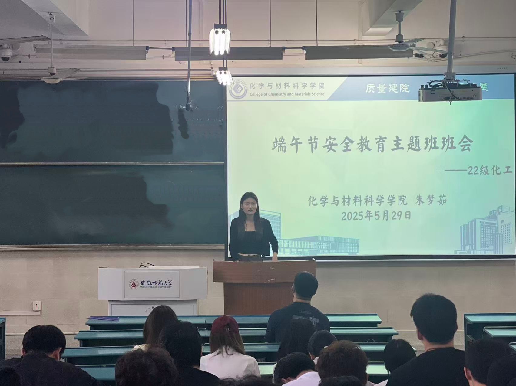 汤雷)端午佳节将至,为切实保障学生假期安全,增强学生安全防范意识,2025年5月29日,2022级化学工程与工艺专业在2010104教室,由辅导员朱梦茹老师组织开展端午节假期安全教育主题班会,为学生们送上一份 “安全指南”,确保全体学生度过一个平安、欢乐的节日。