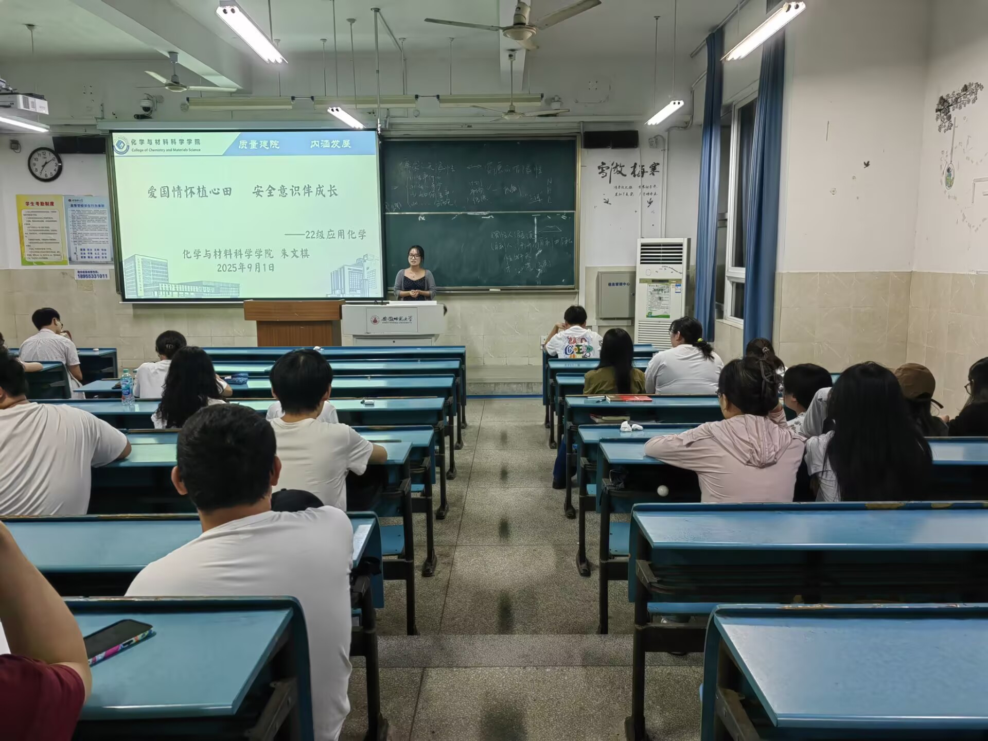 为2022级应用化学专业学生举办了一场意义深远的主题教育讲座。本次讲座以“爱国情怀植心田 安全意识伴成长”为主题,由学院辅导员朱文棋主讲,旨在强化学生的家国情怀和安全防范意识。