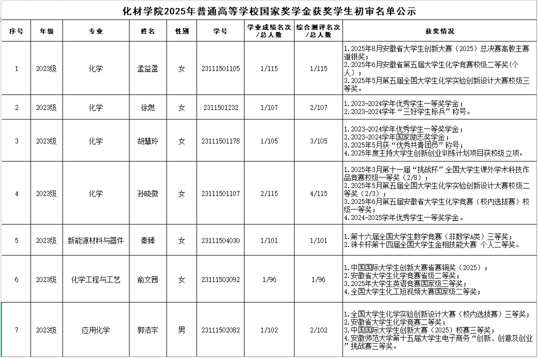 根据《安徽师范大学国家奖学金评审办法(修订)》 《安徽师范大学国家励志奖学金评审办法(修订)》文件精神,按照《关于做好我校本科生2025年国家奖助学金评审推荐工作的通知》要求,经评议,现将卡通色情 2025年国家奖学金、国家励志奖学金获奖名单予以公示。