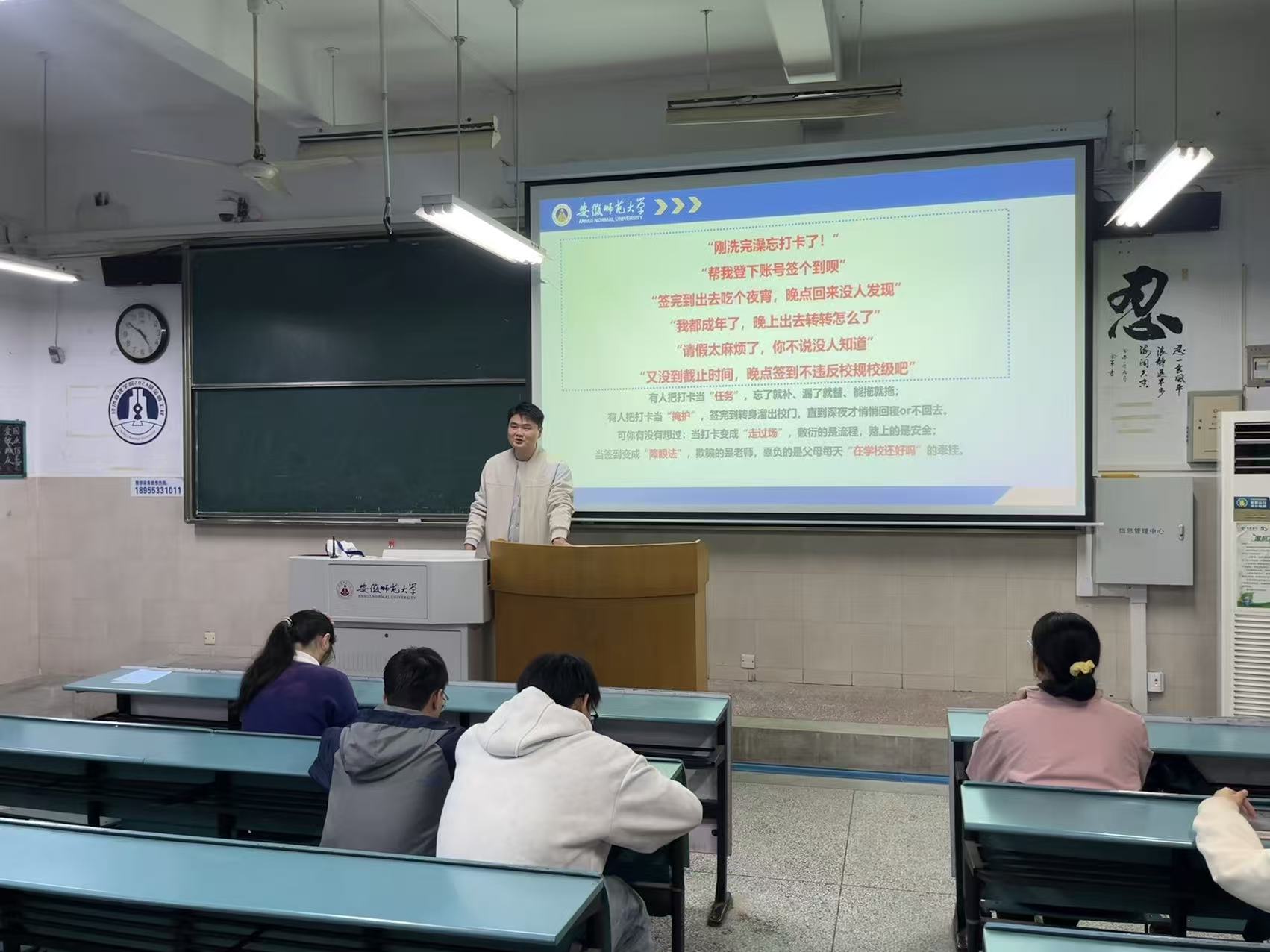 针对学生群体中存在的代打卡、签到后擅自离校、晚归不报备等问题,班会重申学生管理“四项禁令”,明确下一步将通过班委核查、面部清晰签到、提前报备外出等举措,压实安全责任,引导学生从“被动遵守”转变为“主动守护”。