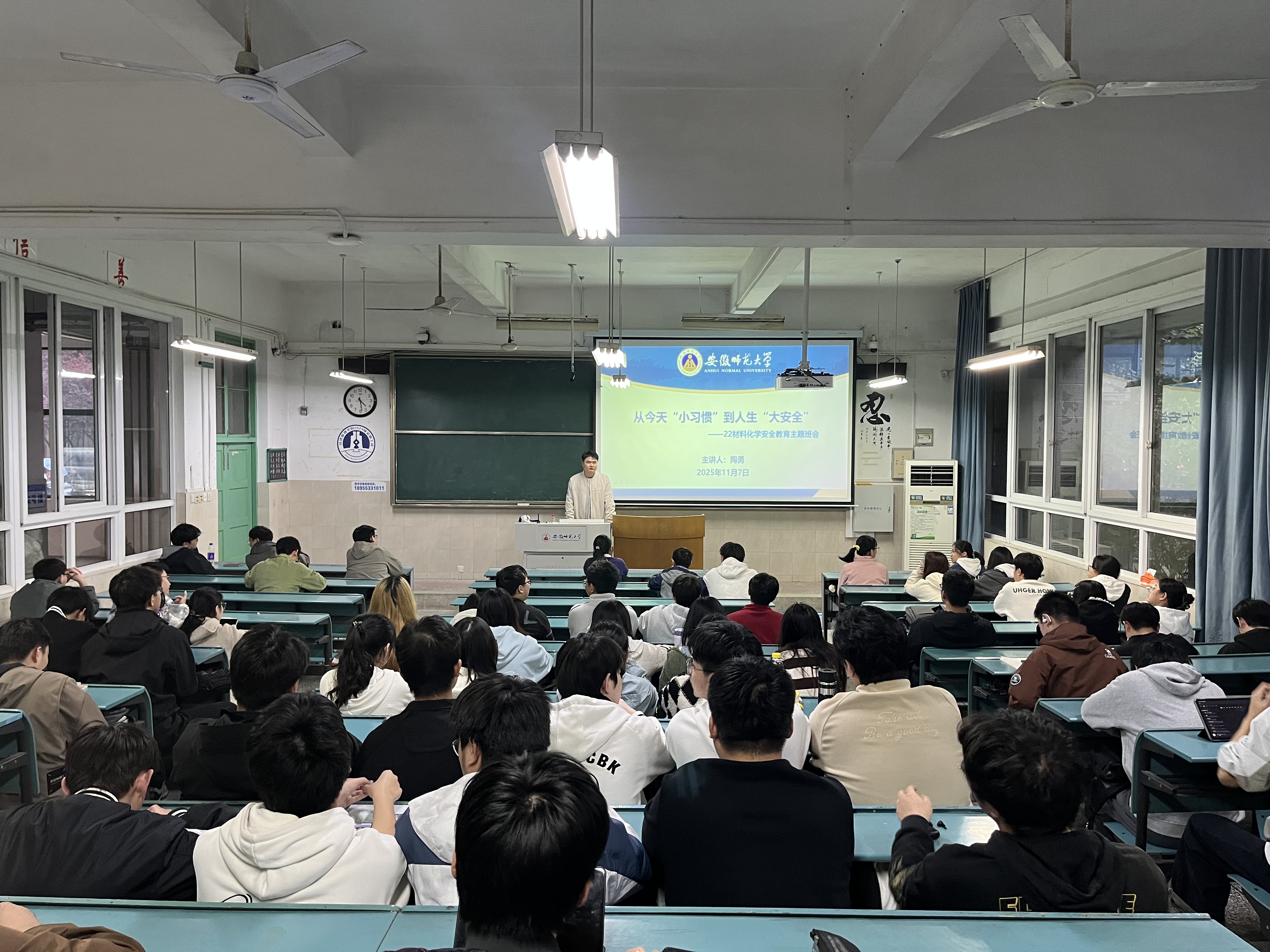 为强化学生安全防范意识,培养良好安全行为习惯,切实保障学生人身财产安全,2025年11月7日,22材料化学专业以“从今天‘小习惯’到人生‘大安全’”主题在行知楼2020101教室召开安全教育班会,班会由辅导员陶勇老师主讲,22级材料化学专业全体学生参与。