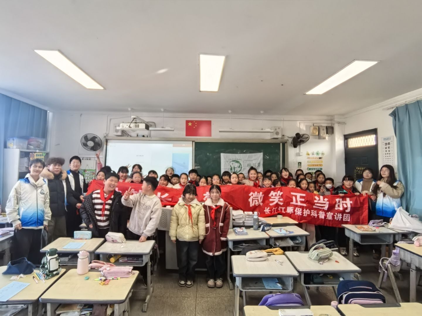 志愿者通过生动形象的讲解与图片展示,系统介绍了长江江豚的外形特征、生活习性及其在长江流域面临的生存威胁。课堂上,学生们不仅了解到江豚被誉为“微笑天使”的由来,也深刻认识到保护长江生态环境对江豚存活的重要性。