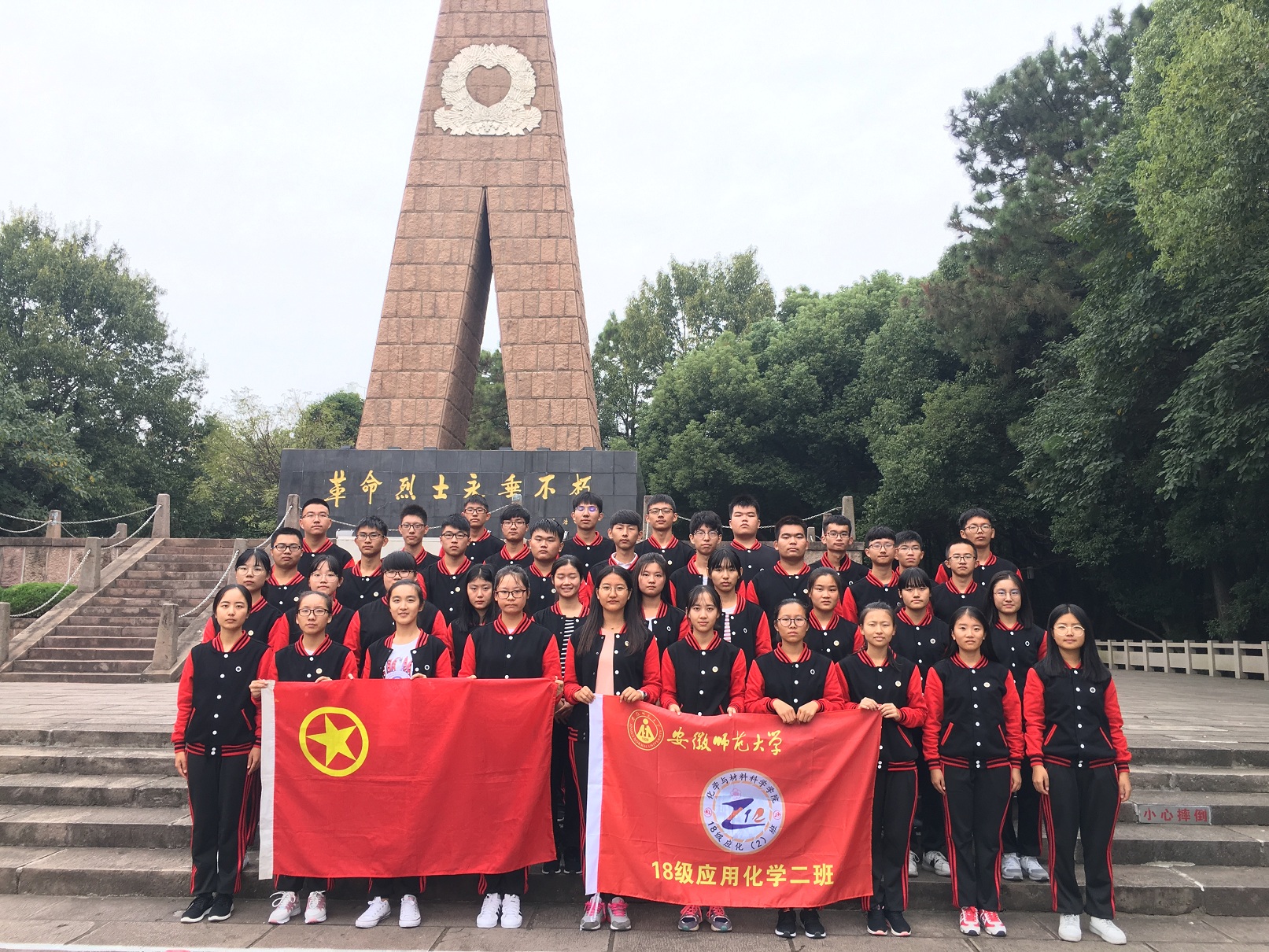 本网讯 (18应化2班 吴吉祥)为缅怀革命先烈,2018年10月14日2018级应用化学2班全体学生在辅导员陶勇的带领下迎着初秋的朝阳在烈士陵园开展了以“寻先烈足迹,‘宏’革命精神”为主题的活动。 为切身体会革命精神,我们在到达烈士陵园后,开展了有序的参观活动。在辅导员带领下,我们参观了烈士陵园。烈士陵园门口的烈士群雕生动展现了革命先烈的爱国事迹,让我们体会到的先烈们敢人为先的伟大精神。进入馆内后,墙壁上挂着的一张张记录着历史性时刻的照片,让在场志愿者们深切感受到了革命烈士的爱国情怀。在参观烈士陵园的过程中,我们重温了一段革命历史,感受到了英雄烈士们不畏牺牲,坚持以人民利益为重的可贵精神。随后,我们在芜湖烈士纪念碑前进行了宣誓和爱国朗诵活动,以此表达对革命烈士致以崇高敬意和深切缅怀。王琦同学说:“从本次活动中我深切感受到了革命烈士的大无畏的精神,我以后会把这种精神发扬在学习生活中去。” 从烈士陵园离开后,我们转身来到了安徽师范大学赭山校区去寻找化材院最原始的样子,我们校园里寻找着化材院曾留下的足迹,这次寻根之旅不禁让我们感叹化材院身为一个建院已久院系的深刻内涵,化材院的悠久历史令应化学子引以为傲,我们也有信心为它的未来填上绚烂的一笔。 这次是活动旨在督促大学生铭记历史,学习并弘扬先烈们的精神,重视自身精神文明建设,为社会主义精神文明建设做贡献。“我们组织这次活动,是希望能够提高同学们的爱国意识,弘扬长征精神。‘宏’革命精神不仅仅是一种精神,更是一种信仰。”应用化学专业辅导员陶勇如是说。今后的日子里我们定会不辱使命,共创辉煌!