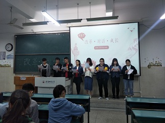 全体成员在团支书秦路路的引导下,了解到了中国改革开放这些年来的影响。大到中国综合国力的迅速提高,微至居民“吃穿住行”水平的上升,无不在于十一届三中全会中提出的改革开放政策。现如今,中国正在以开放的新英姿在世界经济舞台上发挥着越来越重要的作用!