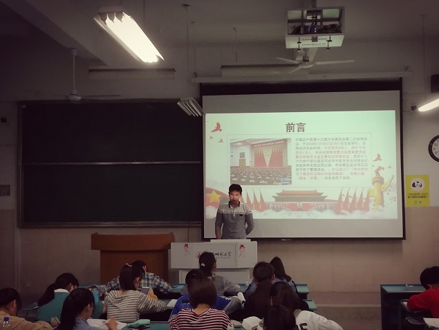 4月19日晚,2017级应用化学2班团支部在教学楼2050103教室举行了学习党章,学习十九届二中、三中全会精神的学习活动。