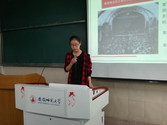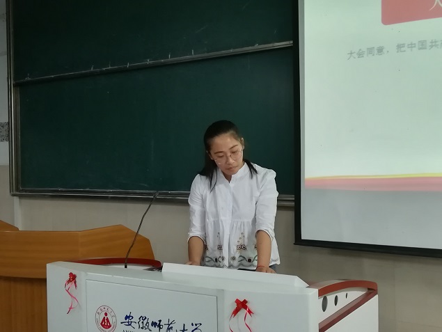 组织委员张雪和第一团小组组长宛欣鑫共同带领大家学习了新党章的具体内容。随后围绕习近平新时代中国特色社会主义思想和五大发展理念、“一带一路”、中国梦等主题,同大家一起体会中国共产党一路走来的艰辛历程,让同学们进一步的认识中国共产党,了解中国共产党。
