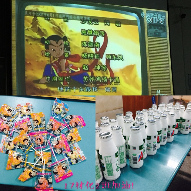 活动在一片欢声笑语中开始。首先是“排排坐,分果果”环节,由班委发放怀旧小零食和AD钙奶,每一位同学脸上都写满了快乐和回忆,三两同学结对畅谈自己记忆中的零食。紧接着的环节是“开门大吉”,先由赵佩微同学为大家播放童年动画合集,合集中不仅有中央轮播动画,还有日韩经典;而后是播放童年动画主题曲,同学们根据歌曲前奏抢答题目。全班同学的积极参与将活动气氛推向高潮。最令人瞠目结舌的是王汉同学连续抢答并成功答对四道题,更有汤玉坤和王汉同学带来的合唱《巴拉拉小魔仙》引起全班热烈掌声。同学们也不由自主的参与了合唱,渐渐地让班级越来越团结。