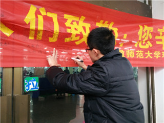 用爱心点亮环保意识,用创意激发环保热情。 安徽师范大学环境保护协会联合芜湖市镜湖区市容管理局开展以“关爱环卫工人”为主题的芜湖市大型公益活动。本次活动分为校内宣传和校外实践两个,在协会工作人员的精心策划与准备下,活动顺利展开并取得一定成效。 校内宣传,志愿招募。近日,环境保护协会于赭山校区食堂门口正式着手宣传,宣告本次活动就此拉开帷幕。在工作人员的宣传下,同学们踊跃报名、积极参与此次志愿活动并在宣传横幅上写下自己对环卫工人的祝福与感恩。宽大的横幅上,布满了一条条祈福的话语、一句句温馨的祝福,这是志愿者们对环卫工人们的敬爱之情,更是是广大同学们对本次活动的肯定与认同!与此同时,协会微信平台同时推出系列宣传活动,将这份冬日里温暖的志愿之火扩散到每位同学心中。