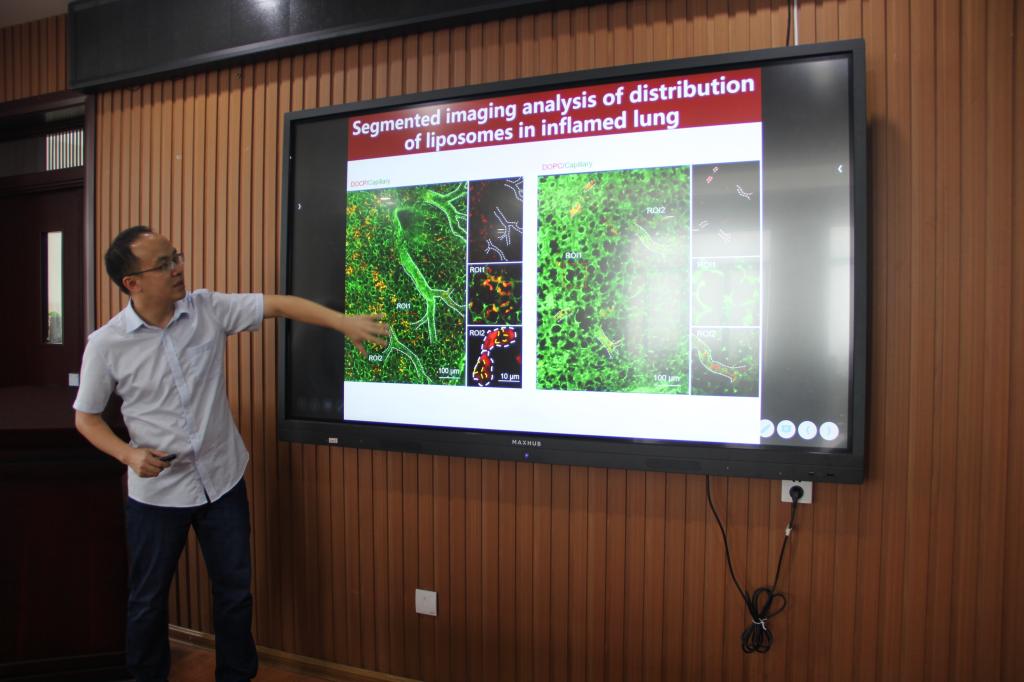 王育才教授作了题为“纳米药物肝脾生物界面的研究与调控”的学术报告。王教授首先阐述了如何解析生物界面等相互作用是纳米药物研究的难点和中性粒细胞作为炎症递送载体的优点,由此进一步介绍了纳米药物与中性粒细胞的相互作用。随后王教授重点介绍了LSP诱导建立肺炎模型,DOCP快速共定位到血液中的中性粒细胞,纳米药物胞内转运的时空解析。最后,王教授介绍了纳米药物的单细胞动力学及其被肝脏清除的机制及如何逆转。会后,现场师生就报告内容积极提出问题,王教授都给予耐心详细的解答。最后报告会在老师和同学们热烈的掌声中结束。