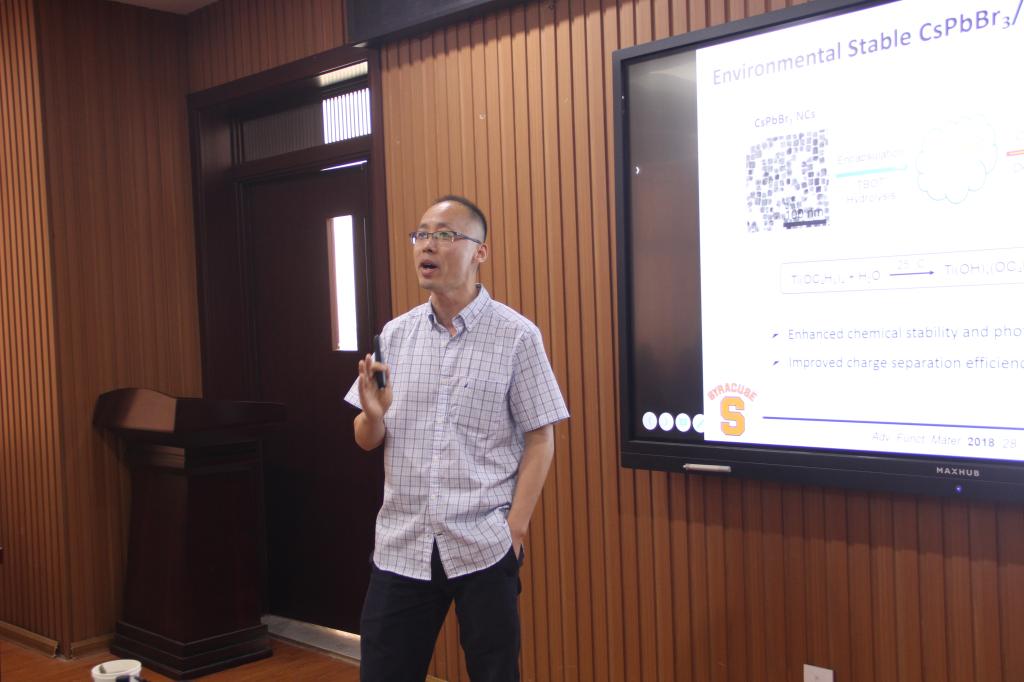 郑伟威博士作了题为“From Impurities to Functionality-Doping in Nanocrystals”的学术报告。郑博士首先介绍半导体量子点具有独特的物理化学性质,在众多领域具有潜在应用前景,长期以来一直备受研究者关注,半导体量子点的功能化和在能源及生物上的应用研究。随后介绍了近期开展的工作及取得的一些成果:在Mn掺杂的CdSe量子点中发现了表面载流子调制的铁磁耦合,Cr掺杂的CdSe量子点中的低温相转化现象,Cr掺杂的ZnSe量子点,并发现了ZnSe量子点核中存在具有尖晶石结构的ZnCr2Se4包容物,发展了一种灵敏的磁性探针,可用于检测量子点的表面、核及界面的微环境及晶格应力,在水相体系获得了光学上最稳定的非核壳结构的量子点,并通过脂质体胶体模板实现了特定位置的选择性功能化。