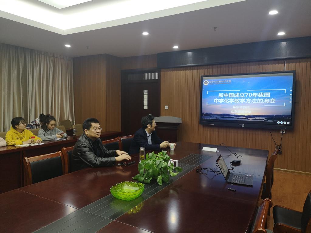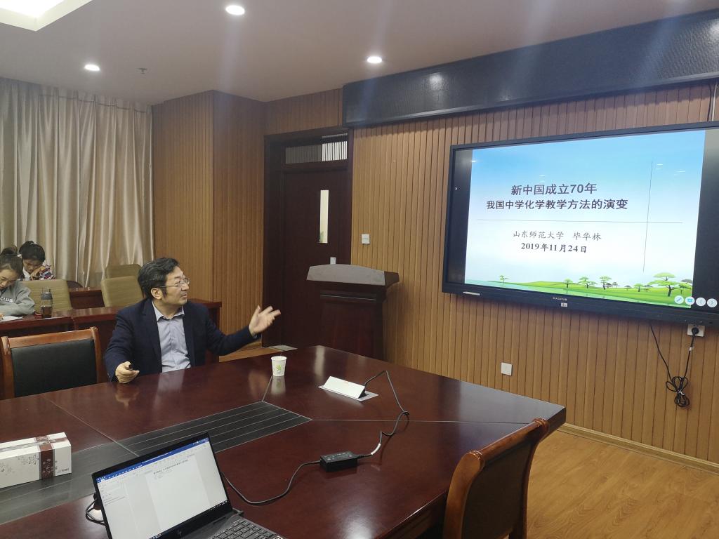 2019年11月24日下午,中国教育学会化学教学委员会常务理事、副秘书长、山东师范大学化学化工与材料科学学院毕华林教授应邀来我校讲学,围绕“新中国成立70年我国中学化学教学方法的演变”做专题报告。本次报告会在花津校区礼勤楼702会议室举行,由安徽师范大学化学教育研究所江教授主持,化学教育研究所全体师生聆听本次报告会。