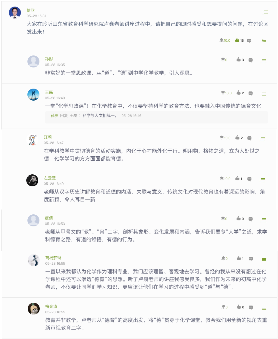 讲座期间,同学们积极地在网络平台上与卢老师展开讨论,纷纷表示这是一节非常震撼的化学思政课!在学科教育中要有意识的贯彻德育活动,内化于心才能外化于行,在以后自己的课堂中做到科学与人文的相统一。最后卢老师耐心细致地答疑,整个讲座高潮迭起,精彩不断。