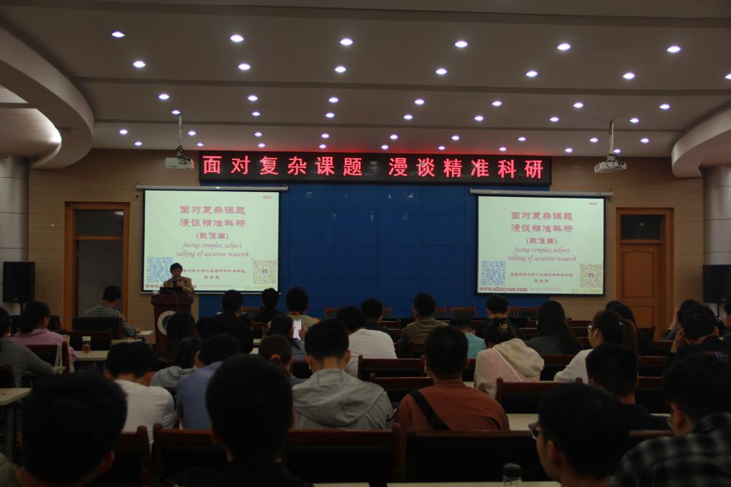 孙益民教授作了题为“面对复杂课题,漫谈精准科研”的专题报告。孙教授首先介绍了其团队的合作模式、合作目标和合作费用,以及科学研究四大阶段:实验研究、理论研究、数理研究、数值研究。随后介绍了研究方向选定的实验研究因素,包括反应物、底物和催化剂等的选择。着重讲授了高熵实验设计基本原理,孙教授强调“质量确定了方向,数量决定了成功”。接着孙教授阐述了材料实验研发制备数字解决方案,即实验需要设计,设计需要系统。举例介绍了高熵设计神经网络及其相关生产制造和应用,总结了实验分析方法。最后孙教授总结了HEED-AANN方法内涵,告诫同学们“石油和煤炭是自然的负熵库,知识和智慧是人类的负熵库,攫取它们让你充满正能量。”会后,孙教授就本次报告内容与在座师生进行了热烈而友好的互动交流。