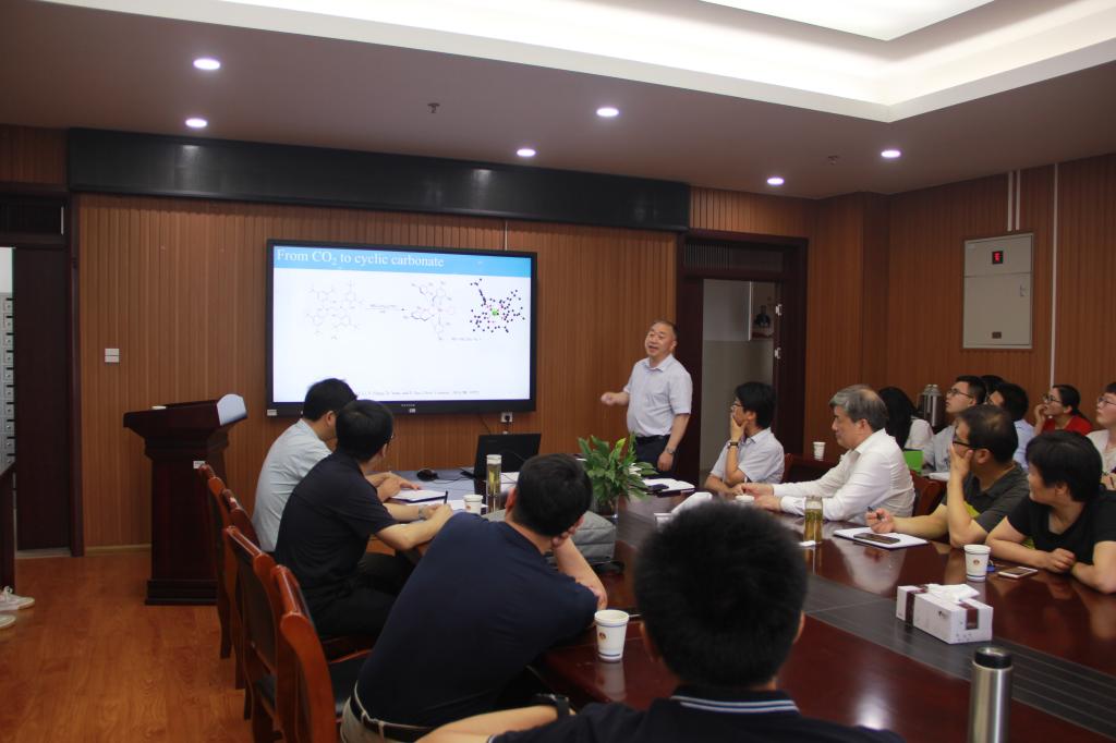 姚英明教授作了题为“含稀土金属配合物的合成及其在CO2转化中的应用”的学术报告。温室效应以及二氧化碳的处理一直是近代以来科研的一个热门话题,姚教授首先举例介绍了近代科研关于二氧化碳处理的一些方法,CO2通过催化反应合成聚碳酸酯和环碳酸酯。接着探讨了关于环氧烷催化环加成条件的筛选以及单稀土金属体系与双稀土体系在一些方面的区别,发现双稀土体系与单一稀土体系比较,更有利于形成相对稳定的化合物结构,双稀土金属除位阻大的环氧环需要高温高压条件外,其他双取代环氧烷都可以很容易合成。为了更好的解释催化方面的特点,姚教授就催化过程机理方面做了详细介绍,并在动力学的熵、活化能方面分析了稀土化合物催化二氧化碳转化的特点。最后通过PXRD数据分析等系列相关性质的比较得出杂双金属比单一稀土金属体系催化活性高,活性好。会后,姚教授就报告内容与与会师生进行了交流探讨。