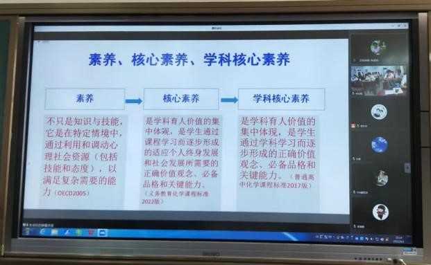 朱成东老师首先介绍了教育部2022年刚刚颁布的义务教育化学课程标准组成:课程性质、课程理念、课程目标、课程内容、学业质量和课程实施,并阐释了高质量课堂教学的组成要素,强调中学教师应以义务教育化学课程标准为理论基础组织课堂教学。接下来,朱老师对素养、核心素养、学科核心素养及化学学科核心素养一一分析,并对化学、物理、生物、科学四大课程及义务教育、普通高中两个阶段所需要培养的核心素养进行对比,强调化学学科核心素养的整合和衔接。最后朱老师将化学学科核心素养与三维目标相联系,以真实的课堂案例向同学们讲解在新义务教育化学课程标准的背景下,如何设计单元教学、项目式教学及跨学科教学。
