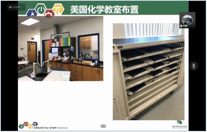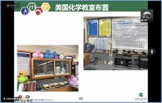 在本次交流活动中,何鹏博士结合自己在美国求学、工作及研究的亲身经历,用镜头记录了美国真实的高中课堂、科学教育及基础教育研究现状。何老师通过图片展示,带领大家走进一所公立高中,美国义务教育为十二年,这所美国高中为走班制。介绍了美国的教育真实情况,如化学实验室的布局、日常高中生的学习生活环境,在课堂中以小组合作学习为主,以及独具特色的教学方式和策略。开拓了师生的国际视野,了解了美国课堂和中国课堂的相同与不同之处。