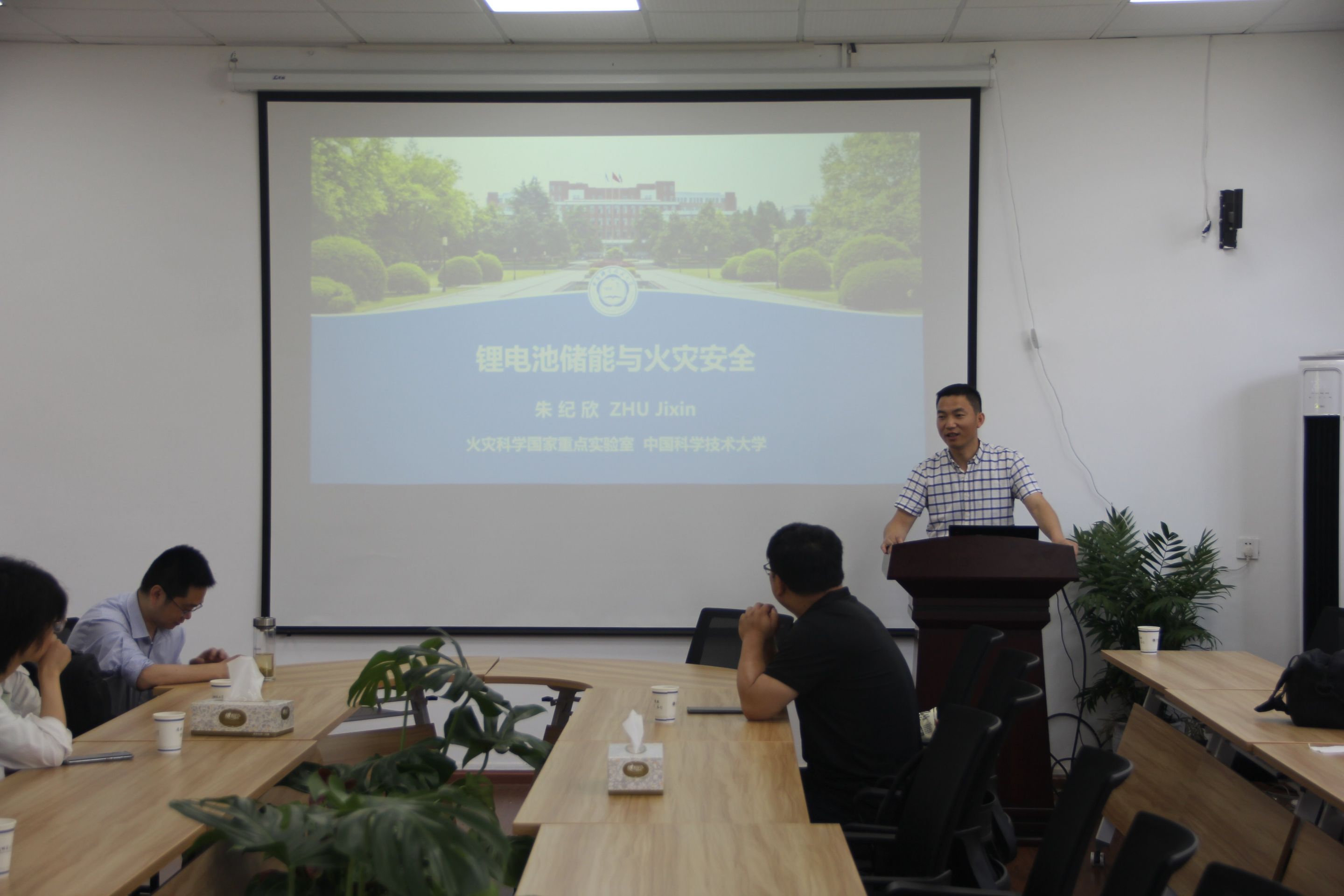 朱纪欣教授作了题为“锂电池储能与火灾安全”的学术报告。朱教授从能源储存与热安全防护问题入手,介绍了储能材料的最新进展以及电池安全的预警策略和操控机制。随后,朱教授针对电池的高效储能、火灾的智能监控、消防的安全防护等问题进一步展开。接着朱教授阐述了金属无机氧化物复合材料、金属有机络合物材料、铝金属轻薄高韧多孔集流体多种与锂电池储能相关的材料及其特性。最后,朱教授介绍了用于火灾安全预警的温度监控柔性安全电子器件,以及电池火灾远程操控的远程操控柔性安全电子器件。会后,朱教授与参加会议的师生展开了一系列的学术讨论与交流。