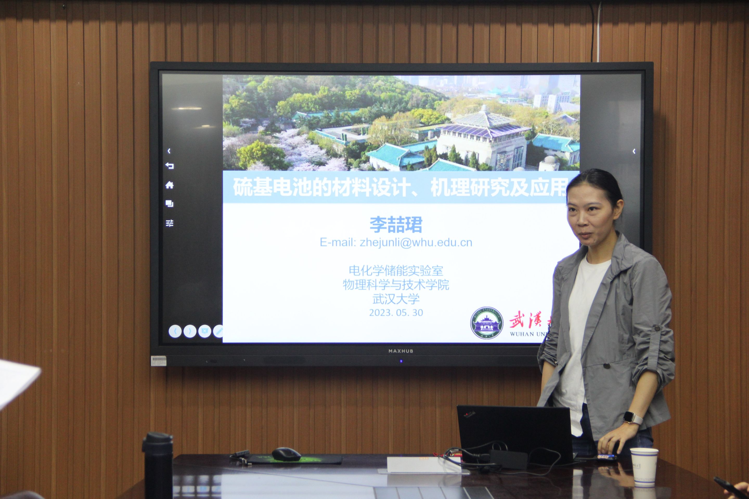 李喆珺教授作了题为“硫基电池的材料设计、机理研究及应用”的学术报告。,李教授首先指出了现有锂电池的不足,从而引出了储量更为丰富、成本更为低廉,能量密度更高并且对环境友好的硫基电池。随后李教授对硫基液流电池的离子交换膜的选择以及性能测试的结果进行了介绍,指出硫基液流电池的优点--能量密度高、成本低及寿命长,并且基于硫基液流电池的缺点指出硫基液流电池的未来发展方向。接着李教授从电池电解液与电池电极催化剂的选择两个方面详细介绍了她的课题组在锂-硫电池材料设计上的工作。最后李教授对硫基电池在大规模无碳电网及无碳交通的应用两方面进行了展望。会后,李教授就报告内容与与会师生进行了讨论,并回答了与会师生提出的问题。