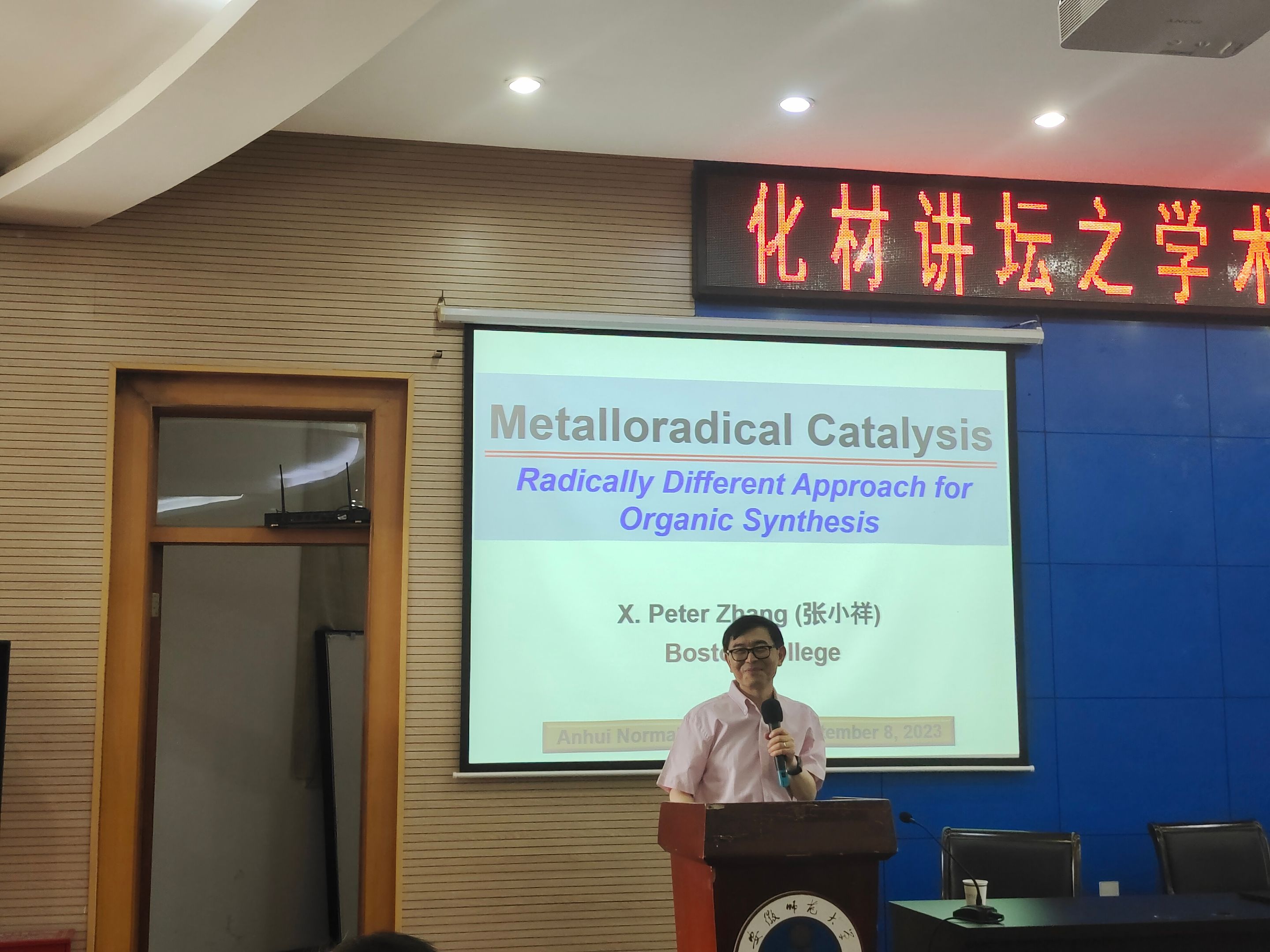 张小祥教授作了题为“Metalloradical Catalysis(MRC): Radically Different Approach for Organic Synthesis”的学术报告。张教授讲解了金属自由基催化对映选择性反应,除了自由基取代和加成反应外,自有机化学还具有离子化学不具有的反应,如自由基攫取反应和自由基β-裂解,实际上,自由基化学在复杂天然产物合成中也有广泛应用。自由基相较与离子化学,有以下优点:在温和条件和中性环境下可以较高速率发生反应,并且有好的官能团耐受性;自由基链式反应相较容易发生和可控,可用于高效构建具有多手性中心的复杂分子。与此同时,自由基化学也有自身的缺点:自由基的产生;反应性的调控,包括反应性,区域选择性、对映选择性等。会后,张小祥教授与会师生展开了一系列学术讨论,并回答了与会师生提出的问题.